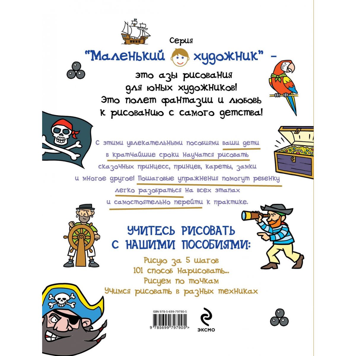 Хотите легко и быстро научить ребенка рисовать? Наше пособие для маленьких художников с удовольствием поможет вам в этом! Пошаговые упражнения наглядно продемонстрируют все этапы создания рисунков, а легкость техники и очаровательные картинки не дадут детям заскучать. Эта книга покажет ребенку, как нарисовать: пирата, попугая, корабельного кота, пиратский флаг, корабль и многое другое!