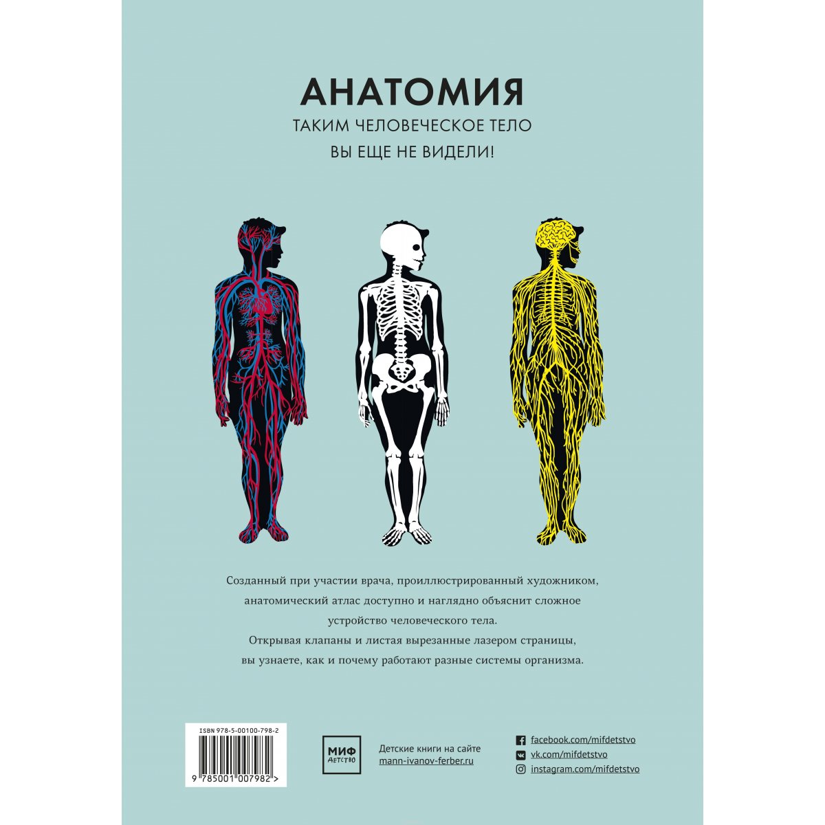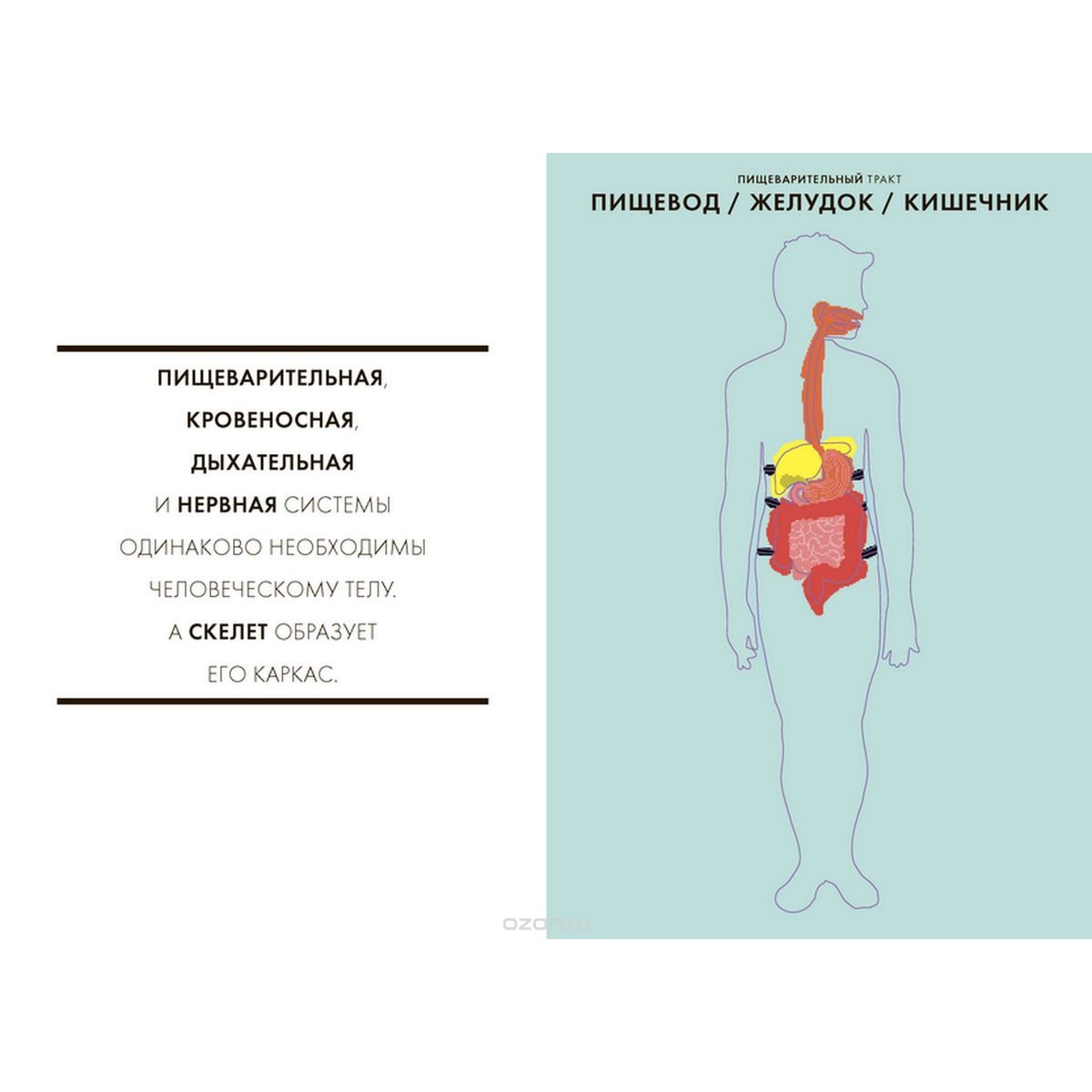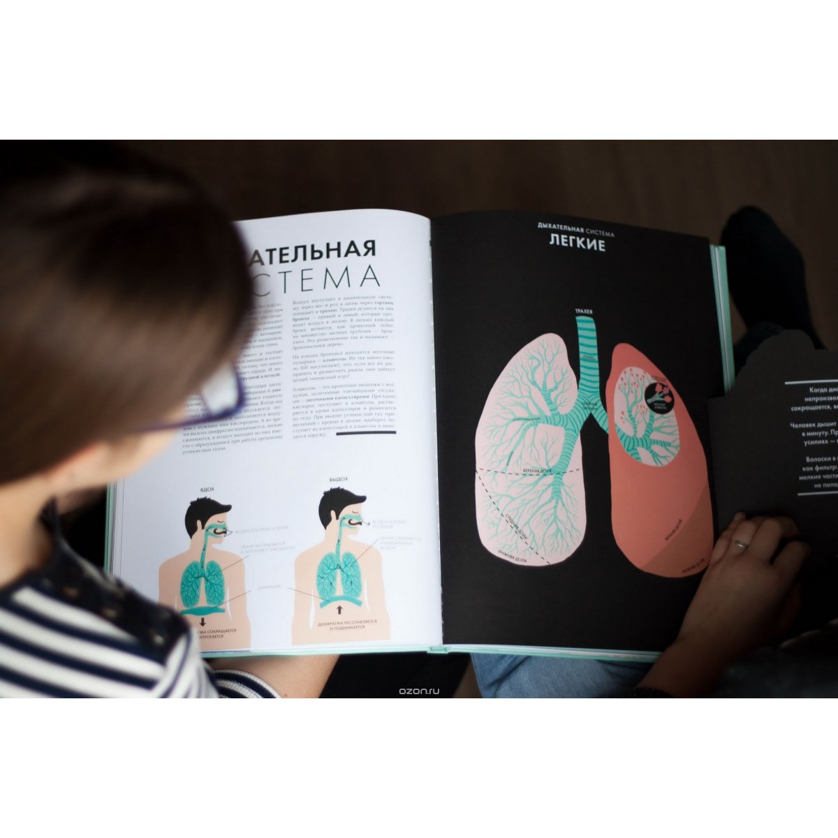 О книгеИллюстрированный атлас по анатомии. В доступной, наглядной и увлекательной форме он рассказывает об устройстве человеческого тела и работе всех систем организма.Иллюстрации в книге выполнены с помощью лазерной резки. Когда страницы наложены друг на друга, мы видим полную картину строения человеческого тела. Когда листаем страницы по одной, можем рассмотреть разные системы, понять, как и почему они работают. Вырезанные клапаны помогают заглянуть внутрь организма. Например, знакомясь с человеческим мозгом, сначала видим изображение головы, а подняв клапан, можем рассмотреть сам мозг и изучить его строение.Книга создана при участии врача, поэтому иллюстрации и описания выверены с анатомической точки зрения. Научным редактором книги выступила физиолог, кандидат биологических наук Ольга Сергеева. В то же время изображения не слишком натуралистичны, чтобы не оттолкнуть ребенка от изучения анатомии.Большой формат и яркое оформление книги делают ее отличным подарком.Фишки книгиВ увлекательной форме рассказывает о человеческом телеПознавательный контент и подробные иллюстрацииПоказывает, как и почему работают разные системы организмаКлапаны и вырезанные лазером страницы интересно рассматриватьПодарочный формат.Как читать эту книгуРебенок может читать книгу сам или вместе с родителями.Работая с книгой совместно, прочитайте вслух об устройстве той или иной системы, а затем позвольте ребенку рассмотреть иллюстрации, заглянуть внутрь человеческого тела, открыть клапаны и полистать резные страницы. Обсудите то, о чем прочитали в книге, вспомните, как это проявляется в жизни.Детям младшего школьного возраста будут интересны иллюстрации. Дети старшего возраста могут самостоятельно читать текст и изучать анатомию.Для кого эта книгаДля детей от 10 летДля родителей, которые хотят рассказать детям о мире и строении тела человека, но не знают какДля всех, кто хочет лучше узнать анатомию и разобраться в себе.
