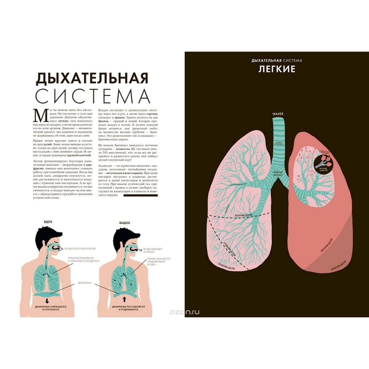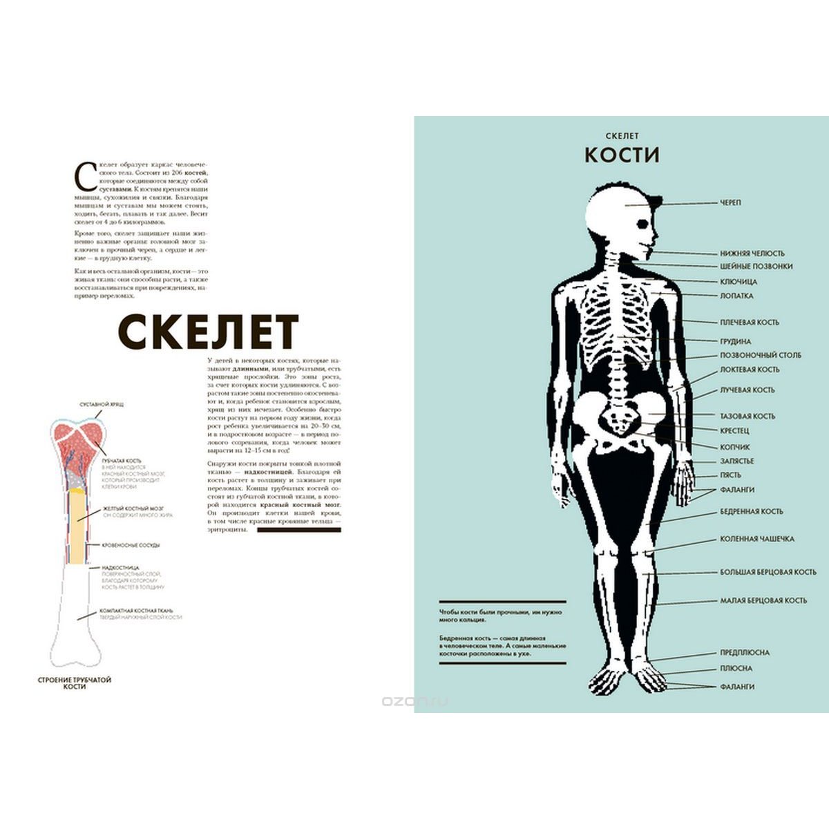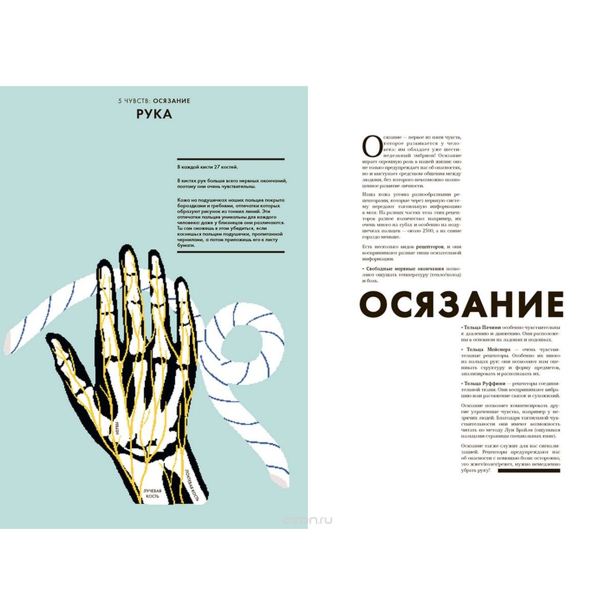 О книгеИллюстрированный атлас по анатомии. В доступной, наглядной и увлекательной форме он рассказывает об устройстве человеческого тела и работе всех систем организма.Иллюстрации в книге выполнены с помощью лазерной резки. Когда страницы наложены друг на друга, мы видим полную картину строения человеческого тела. Когда листаем страницы по одной, можем рассмотреть разные системы, понять, как и почему они работают. Вырезанные клапаны помогают заглянуть внутрь организма. Например, знакомясь с человеческим мозгом, сначала видим изображение головы, а подняв клапан, можем рассмотреть сам мозг и изучить его строение.Книга создана при участии врача, поэтому иллюстрации и описания выверены с анатомической точки зрения. Научным редактором книги выступила физиолог, кандидат биологических наук Ольга Сергеева. В то же время изображения не слишком натуралистичны, чтобы не оттолкнуть ребенка от изучения анатомии.Большой формат и яркое оформление книги делают ее отличным подарком.Фишки книгиВ увлекательной форме рассказывает о человеческом телеПознавательный контент и подробные иллюстрацииПоказывает, как и почему работают разные системы организмаКлапаны и вырезанные лазером страницы интересно рассматриватьПодарочный формат.Как читать эту книгуРебенок может читать книгу сам или вместе с родителями.Работая с книгой совместно, прочитайте вслух об устройстве той или иной системы, а затем позвольте ребенку рассмотреть иллюстрации, заглянуть внутрь человеческого тела, открыть клапаны и полистать резные страницы. Обсудите то, о чем прочитали в книге, вспомните, как это проявляется в жизни.Детям младшего школьного возраста будут интересны иллюстрации. Дети старшего возраста могут самостоятельно читать текст и изучать анатомию.Для кого эта книгаДля детей от 10 летДля родителей, которые хотят рассказать детям о мире и строении тела человека, но не знают какДля всех, кто хочет лучше узнать анатомию и разобраться в себе.