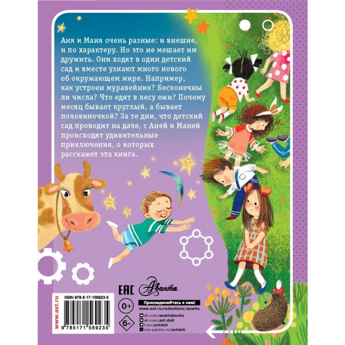 Аня и Маня очень разные, и внешне, и по характеру. Но это не мешает им дружить. Они ходят в один детский сад и вместе узнают много нового об окружающем мире. Например, как устроен муравейник? Бесконечны ли числа? Что едят в лесу ежи? Почему месяц бывает круглый, а бывает половиночкой? За те дни, что детский сад проводит на даче, происходят необыкновенные события: Аня и Маня знакомятся с огромным говорящим Ежом, узнают историю старого Шкафа, летают при свете Месяца и спорят, бывают ли коровы песочного цвета.