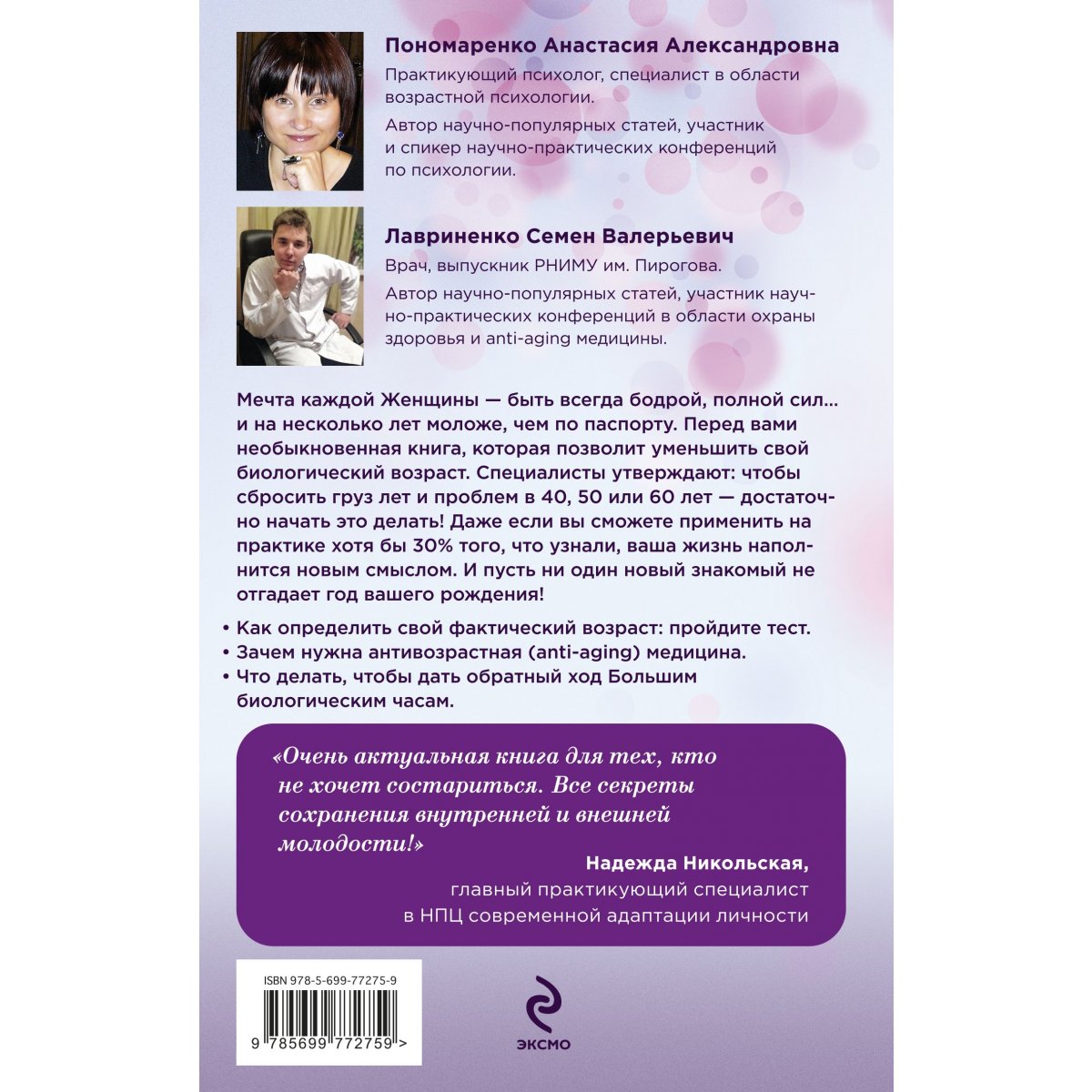 "Таблетка молодости", к сожалению, все еще не изобретена, но мечта любой Женщины – быть всегда красивой, бодрой, полной сил… и на несколько лет моложе, чем по паспорту, – оказывается, может стать реальной. Перед вами необыкновенная книга, которая действительно позволит Вам уменьшить свой биологический возраст. Авторы книги, квалифицированные психолог и врач, уверены: молодость – это не количество лет, а здоровье не уходит с возрастом! В 40, 50 или 60 лет у вас появляются новые преимущества для того, чтобы обрести второе дыхание. 5 конкретных правил, предложенных специалистами, позволят мгновенно запустить механизмы омоложения, хорошего самочувствия и уверенности в себе. Вы сможете посчитать свой фактический возраст, пройти тест на долголетие, узнать возможности anti-aging медицины и дать обратный ход Большим Биологическим часам. Книга даст необходимую информацию и станет отправной точкой, чтобы расправить плечи и жить так, как вы даже не мечтали.