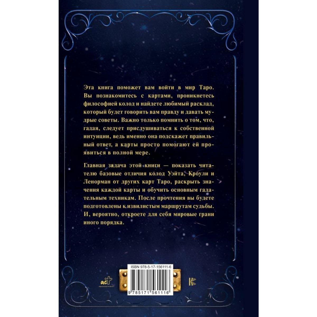 Главная задача этой книги — показать читателю базовые отличия колод Уэйта, Кроули и Ленорман от других карт Таро, раскрыть значения каждой карты и обучить основным гадательным техникам. После прочтения вы будете подготовлены к извилистым маршрутам судьбы. И, вероятно, откроете для себя мировые грани иного порядка.