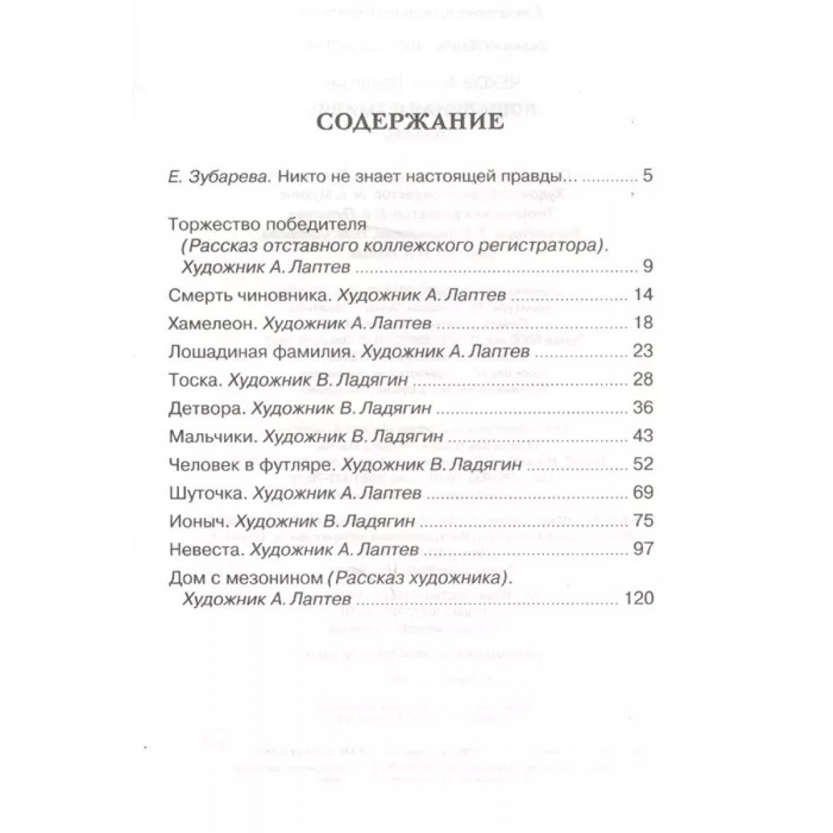 В сборник вошли избранные рассказы А. П. Чехова с иллюстрациями выдающихся мастеров книжной графики – Алексея Лаптева и Владимира Ладягина.