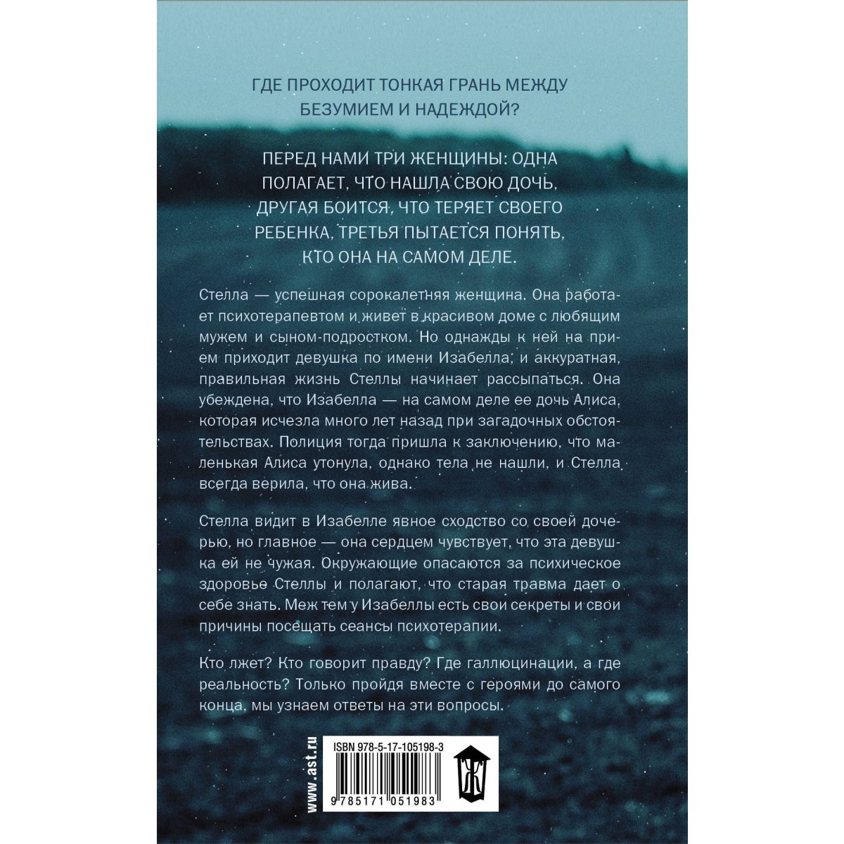 Где проходит тонкая грань между безумием и надеждой? Перед нами три женщины: одна полагает, что нашла свою дочь, другая боится, что теряет своего ребенка, третья пытается понять, кто она на самом деле. Стелла — успешная сорокалетняя женщина. Она работает психотерапевтом и живет в красивом доме с любящим мужем и сыном-подростком. Но однажды к ней на прием приходит девушка по имени Изабелла, и аккуратная, правильная жизнь Стеллы начинает рассыпаться. Она убеждена, что Изабелла — на самом деле ее дочь, Алиса, которая исчезла много лет назад при загадочных обстоятельствах. Полиция тогда пришла к заключению, что маленькая Алиса утонула, однако тела не нашли, и Стелла всегда верила, что она жива. Стелла видит в Изабелле явное сходство со своей дочерью, но главное — она сердцем чувствует, что эта девушка ей не чужая. Окружающие опасаются за психическое здоровье Стеллы и полагают, что старая травма дает о себе знать. Меж тем у Изабеллы есть свои секреты и свои причины посещать сеансы психотерапии. Кто лжет? Кто говорит правду? Где галлюцинации, а где реальность? Только пройдя вместе с героями до самого конца, мы узнаем ответы на эти вопросы.