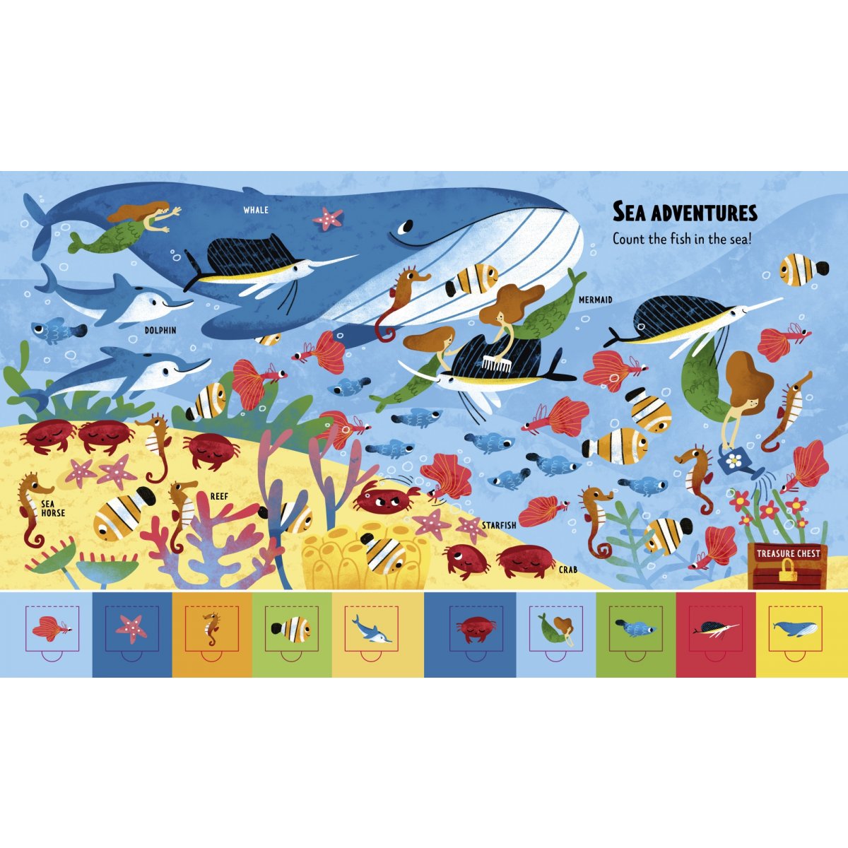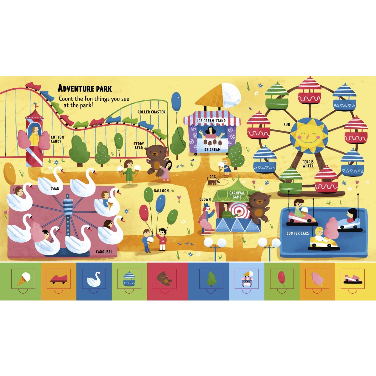 Каждый разворот — большая сюжетная иллюстрация! Вас ждет солнечный пикник, шумный зоопарк, лесные прятки и морские приключения! Сосчитайте все новогодние подарки, помогите обезьянке и пиратам уплыть с далекого острова, посетите магазин игрушек и сосчитайте все, что только увидите! Веселые окошки-клапаны превратят обучение в увлекательную игру.