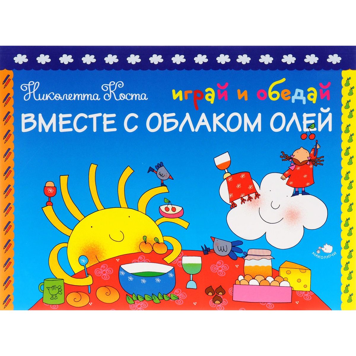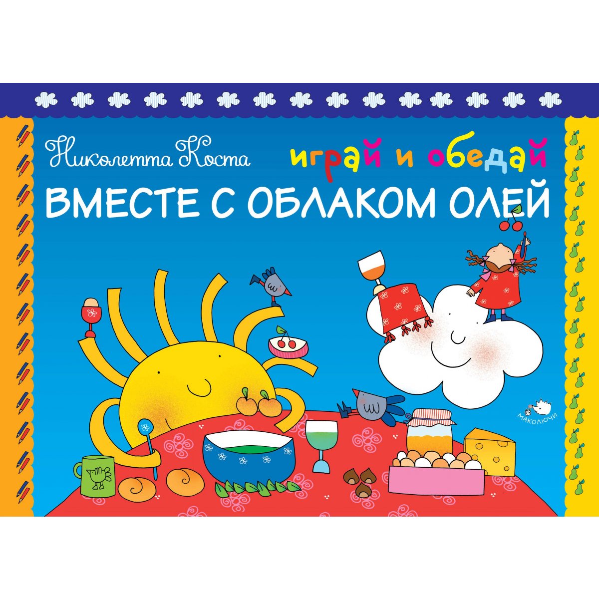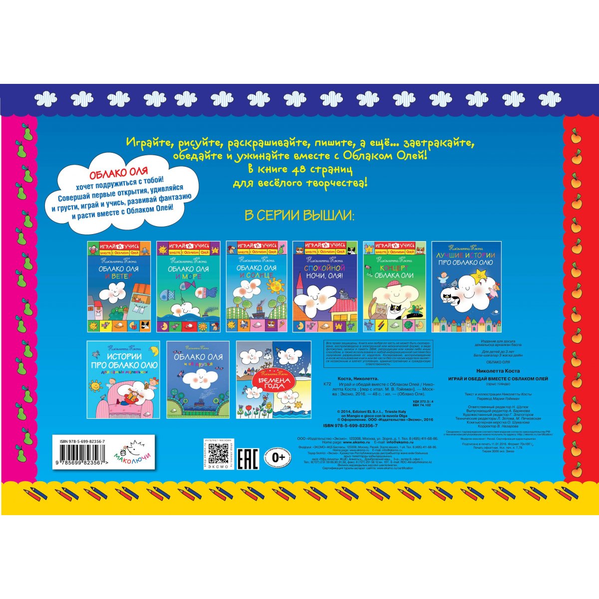 Играйте, рисуйте, раскрашивайте, пишите, а ещё… завтракайте, обедайте и ужинайте вместе с Облаком Олей! В книге 48 страниц для весёлого творчества! Облако по имени Оля – персонаж родом из Италии, который так полюбился уже сотням тысяч детей по всему миру! Впервые в России книга-плейсмат – популярный в Европе вид детских изданий для творчества и развития! Страницы этой книги можно вынуть и положить на стол. Теперь рисовать, писать и раскрашивать можно прямо во время завтрака, обеда и ужина! Для детей до 3-х лет.