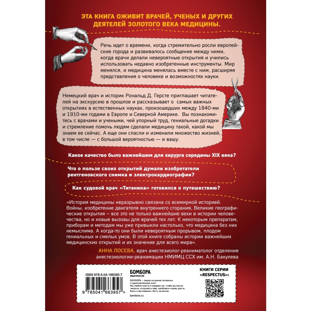 Автор, немецкий врач и историк, приглашает вас в путешествие, посвященное многочисленным открытиям золотого века медицины. Блестящие ученые и врачи этой поры произвели колоссальный переворот в мире: разработали способы диагностики серьезных заболеваний, создали правила ухода за больными, снизили риск для жизни пациента при проведении операций. Мы высоко ценим их достижения сегодня, но не представляем, насколько они изменили жизнь человечества.