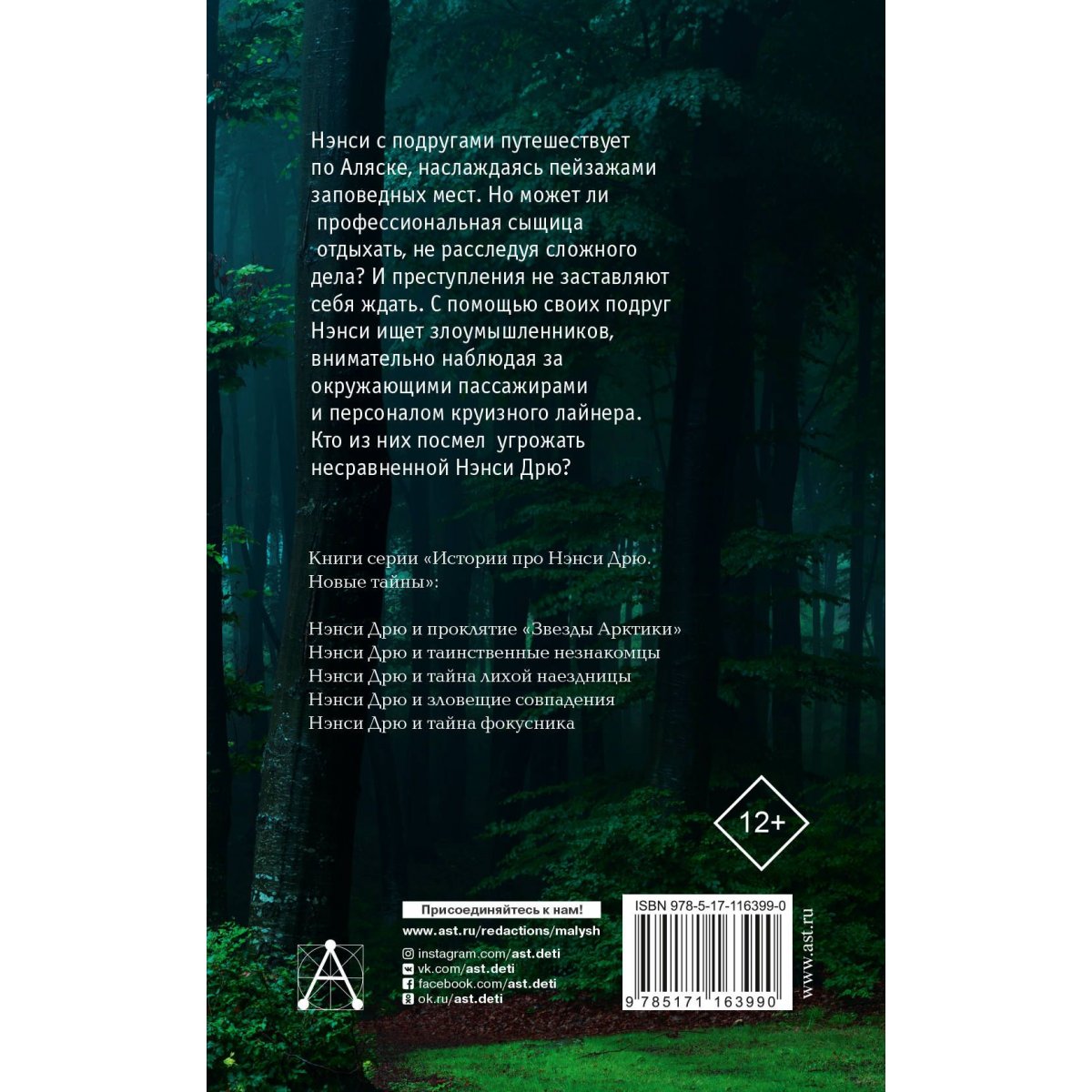 Нэнси Дрю — это литературный и киноперсонаж, девушка-сыщица, ставшая известной во многих странах мира. Впервые Нэнси появилась в книге «Тайна старых часов» в 1930 году. Книги были написаны рядом авторов и выпущены под коллективным псевдонимом «Кэролайн Кин». За десятилетия образ Нэнси эволюционировал: стал менее уверенным и более женственным. В книге «Нэнси Дрю и таинственные незнакомцы» Нэнси с подругами путешествует по Аляске, наслаждаясь пейзажами заповедных мест. Но может ли профессиональная сыщица отдыхать, на расследуя сложного дела? С помощью своих подруг Нэнси ищет злоумышленников, внимательно наблюдая за окружающими пассажирами и персоналом круизного лайнера. Популярность истории про Нэнси Дрю не угасает. За все эти годы было продано более 80 миллионов книг на 45 языках мира. По мотивам книг было снято пять фильмов, два телесериала и выпущено 30 компьютерных игр. Изображение Нэнси было использовано на разнообразных товарах.