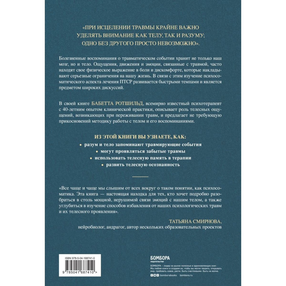 В своей книге Бабетта Ротшильд, всемирно известный психотерапевт с 40-летним опытом клинической практики, описывает роль телесных ощущений и реакций, которые возникают после пережитых травм и стресса. Соединив в терапии вербальный и телесно-ориентированный подходы, клиницист предлагает не требующую прикосновений методику работы с телом и его воспоминаниями для лечения посттравматического стрессового расстройства.