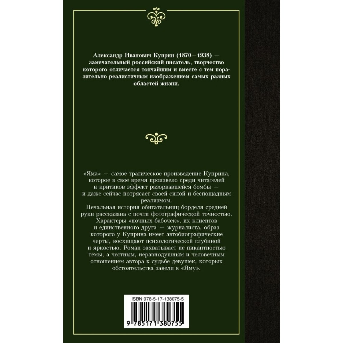 "Яма" — самое трагическое произведение Куприна, которое в свое время произвело среди читателей и критиков эффект разорвавшейся бомбы, и даже сейчас потрясает своей силой и беспощадным реализмом. Печальная история обитательниц борделя средней руки рассказана с почти фотографической точностью. Характеры "ночных бабочек", их клиентов и единственного друга — журналиста, образ которого у Куприна имеет автобиографические черты, восхищают психологической глубиной и яркостью. Роман захватывает не пикантностью темы, а честным, неравнодушным и человечным отношением автора к судьбе девушек, которых обстоятельства завели в "Яму".