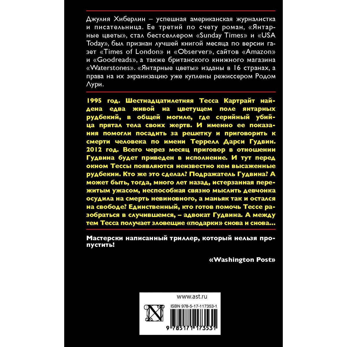 Джулия Хиберлин – успешная американская журналистка и писательница. Одним из первых романов, сильно на нее повлиявшим и подтолкнувшим на написание собственного, была "Анна Каренина". Может, именно поэтому ее романы отличает глубокий психологизм, выверенный слог, сложный сюжет и яркая, сильная героиня в центре повествования. Так, ее третий по счету роман "Янтарные цветы" мгновенно стал бестселлером, был издан в 16 странах, признан лучшей книгой месяца по версии газет "Times of London" и "Observer", а также сайтов "Amazon" и "Goodreads". Права на экранизацию куплены режиссером Родом Лури.Книга рассказывает историю Тессы Картрайт, которая в шестнадцать лет оказалась в руках серийного убийцы. Чудом уцелевшую, ее нашли на поле янтарных рудбекий, в могиле с другими его жертвами. Она опознала своего мучителя, несмотря на то, что не помнила почти ничего из того, что случилось с ней за эти страшные тридцать два часа.И вот теперь, спустя долгие годы, правосудие, наконец, свершится - убийца будет казнен. Но Тесса начинает подозревать, что она ошиблась и настоящий монстр до сих пор на свободе, а вместо него осудят невиновного человека. Ко всему прочему кто-то все эти девять лет постоянно высаживал перед ее окном те самые янтарные рудбекии… Кто же это был? И зачем оставлял ей "послания"?"Янтарные цветы" - плод моего воображения, - пишет Джулия Хиберлин, - но я задалась целью как можно правдивее отразить в книге основы криминалистики, психотерапии и особенности правовой системы штата Техас...