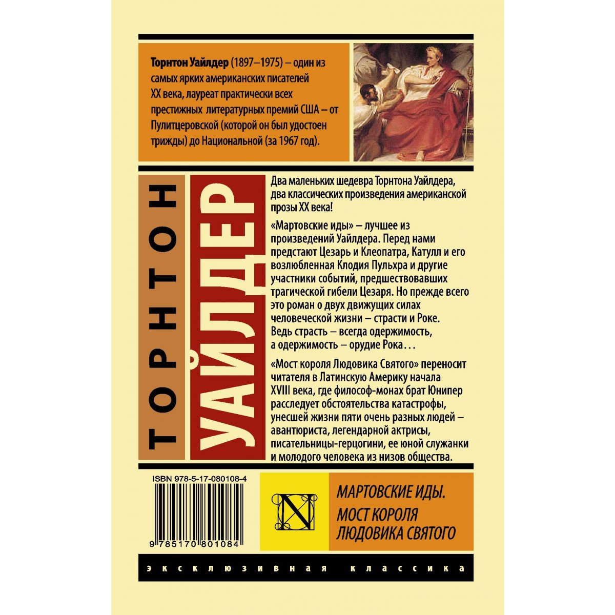 Два маленьких шедевра Торнтона Уайлдера, два классических произведения американской прозы XX века! МАРТОВСКИЕ ИДЫ - лучшее из произведений Уайлдера. Перед нами предстают Цезарь и Клеопатра, Катулл и его возлюбленная Клодия Пульхра и другие участники событий, предшествовавших трагической гибели Цезаря. Но прежде всего это роман о двух движущих силах человеческой жизни - страсти и Роке. Ведь страсть - всегда одержимость, а одержимость - орудие Рока... МОСТ КОРОЛЯ ЛЮДОВИКА СВЯТОГО переносит читателя в Латинскую Америку начала XVIII века, где философ-монах брат Юнипер расследует обстоятельства катастрофы, унесшей жизни пяти очень разных людей - авантюриста, легендарной актрисы, писательницы-герцогини, ее юной служанки и молодого человека из низов общества.