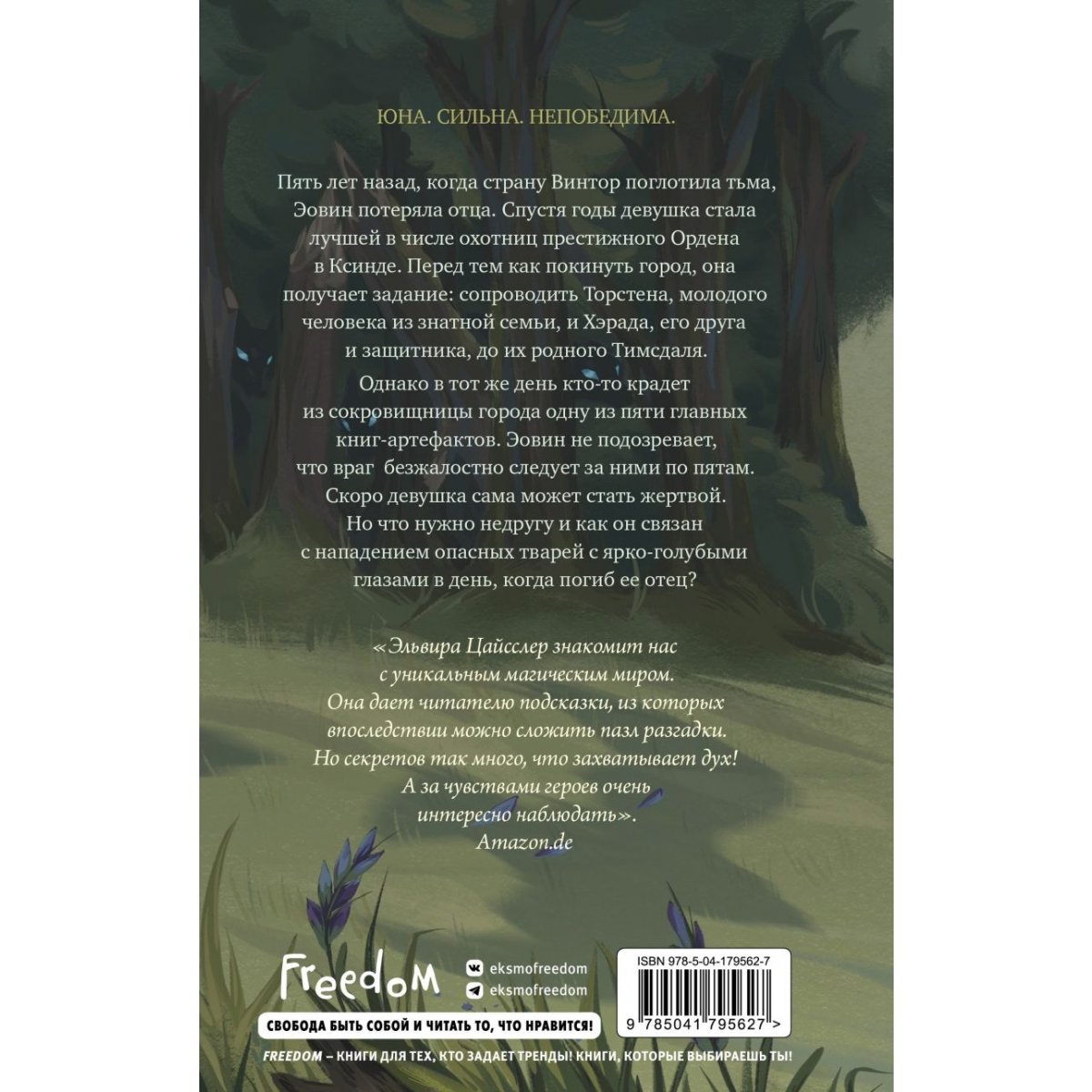 Пять лет назад, когда страну Винтор поглотила тьма, Эовин потеряла отца. Спустя годы девушка стала лучшей в числе охотниц престижного Ордена в Ксинде. Перед тем как покинуть город, она получает задание: сопроводить Торстена, молодого человека из знатной семьи, и Хэрада, его друга и защитника, до их родного Тимсдаля. Однако в тот же день кто-то крадет из сокровищницы города одну из пяти главных книг-артефактов. Эовин не подозревает, что враг безжалостно следует за ними по пятам. Скоро девушка сама может стать жертвой. Но что нужно недругу и как он связан с нападением опасных тварей с ярко-голубыми глазами в день, когда погиб ее отец?