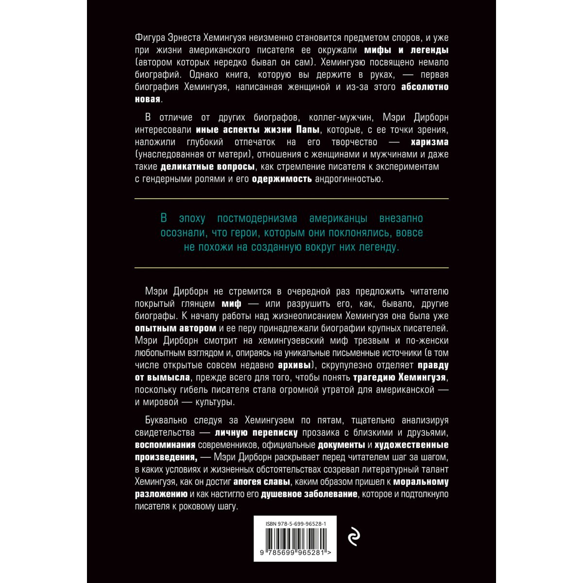 Женский взгляд на непростую историю жизни Эрнеста Хемингуэя.Фигура этого американского писателя неизменно становится предметом споров, и уже при жизни ее окружали мифы и легенды (автором которых нередко бывал он сам).Эта книга - первая биография Хемингуэя, написанная женщиной. В отличие от других биографов, коллег-мужчин, Мэри Дирборн интересовали иные аспекты жизни Папы, которые, с ее точки зрения, наложили глубокий отпечаток на его творчество - харизма (унаследованная от матери), отношения с женщинами и мужчинами и даже такие деликатные вопросы, как стремление писателя к экспериментам с гендерными ролями и его одержимость андрогинностью. В эпоху постмодернизма американцы внезапно осознали, что герои, которым они поклонялись, вовсе не похожи на созданную вокруг них легенду.Мэри Дирборн не стремится в очередной раз предложить читателю покрытый глянцем миф - или разрушить его, как, бывало, другие биографы. К началу работы над жизнеописанием Хемингуэя она была уже опытным автором, и ее перу принадлежали биографии крупных писаталей. Мэри Дирборн смотрит на хемингуэевский миф трезвым и по-женски любопытным взглядом и, опираясь на уникальные письменные источники (в том числе открытые совсем недавно архивы), скрупулезно отделяет правду от вымысла, прежде всего для того, чтобы понять трагедию Хемингуэя, поскольку гибель писателя стала огромной утратой для американской - и мировой - культуры.Буквально следуя за Хемингуэем по пятам, тщательно анализируя свидетельства - личную переписку прозаика с близкими и друзьями, воспоминания современников, официальные документы и художественные произведения - Мэри Дирборн раскрывает перед читателем, шаг за шагом, в каких условиях и жизненных обстоятельствах созревал литературный талант Хемингуэя, как он достиг апогея славы, каким образом пришел к моральному разложению и как настигло его душевное заболевание, которое и подтолкнуло писателя к роковому шагу.