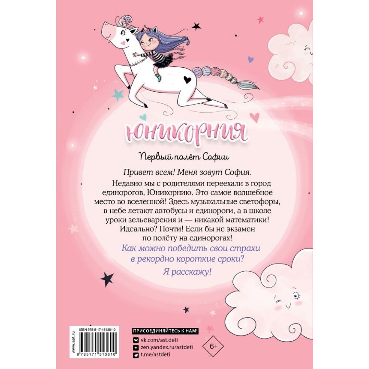 Привет всем! Меня зовут София. Недавно мы с родителями переехали в город единорогов, Юникорнию. Это самое волшебное место во вселенной! Здесь музыкальные светофоры, в небе летают автобусы и единороги, а в школе уроки зельеварения и — никакой математики! Идеально? Почти! Если бы не экзамен по полёту на единорогах! Как можно победить свои страхи в рекордно короткие сроки? Я расскажу!
