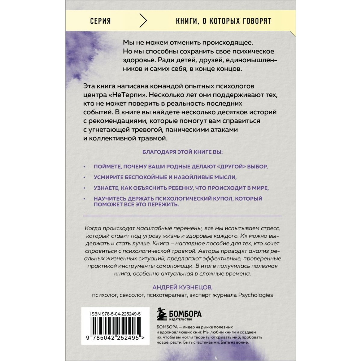 Эта книга написана командой опытных психологов Центра «НеТерпи». Несколько лет они поддерживают тех, кто не может поверить в реальность последних событий. В книге вы найдете несколько десятков историй с рекомендациями, которые помогут вам справиться с угнетающей тревогой, паническими атаками и коллективной травмой.