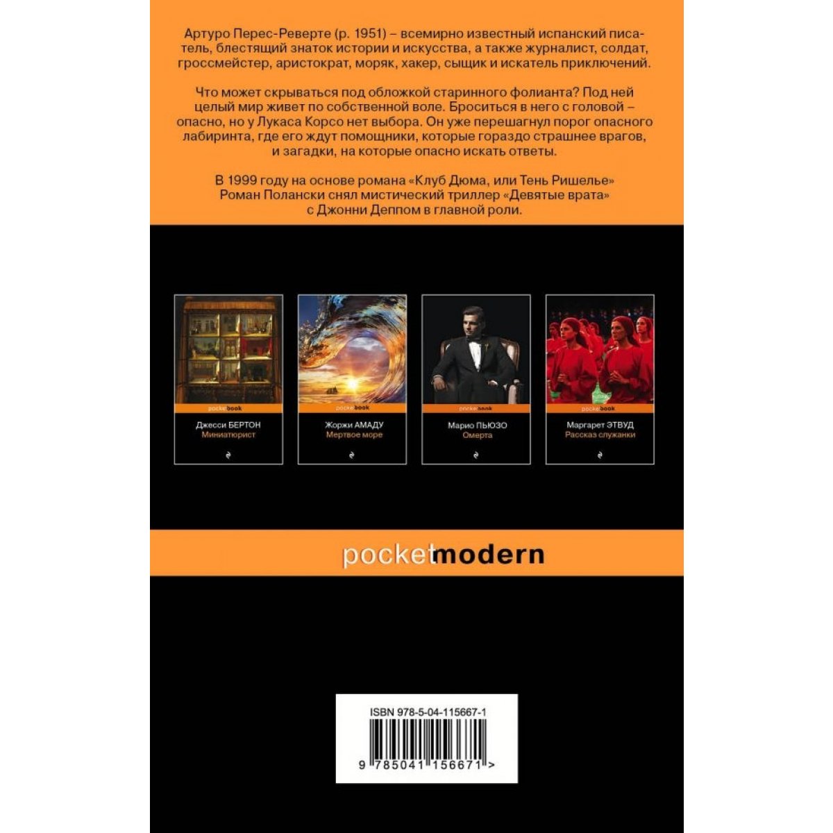Книги дают взрослым людям пищу для ума, козыри для игры и костюмы для маскарада. Букинисты почти правят миром. Писатель, ловелас и мот Александр Дюма-старший — персонаж не менее современный, чем библиофил, бережно хранящий пропавшую рукопись. Охотник за книгами мотается по Европе в поисках сатанинского фолианта, который отправил средневекового печатника на костер. Охотника за книгами хранит падший ангел. Коктейль из реальности и вымысла — отнюдь не вымышленная угроза. В книгах Артуро Переса-Реверте возрождается литература, которую мы всегда любили. В 1999 году по книге "Клуб Дюма" выдающийся режиссер Роман Полански снял фильм "Девятые врата" с Джонни Деппом в роли Корсо.