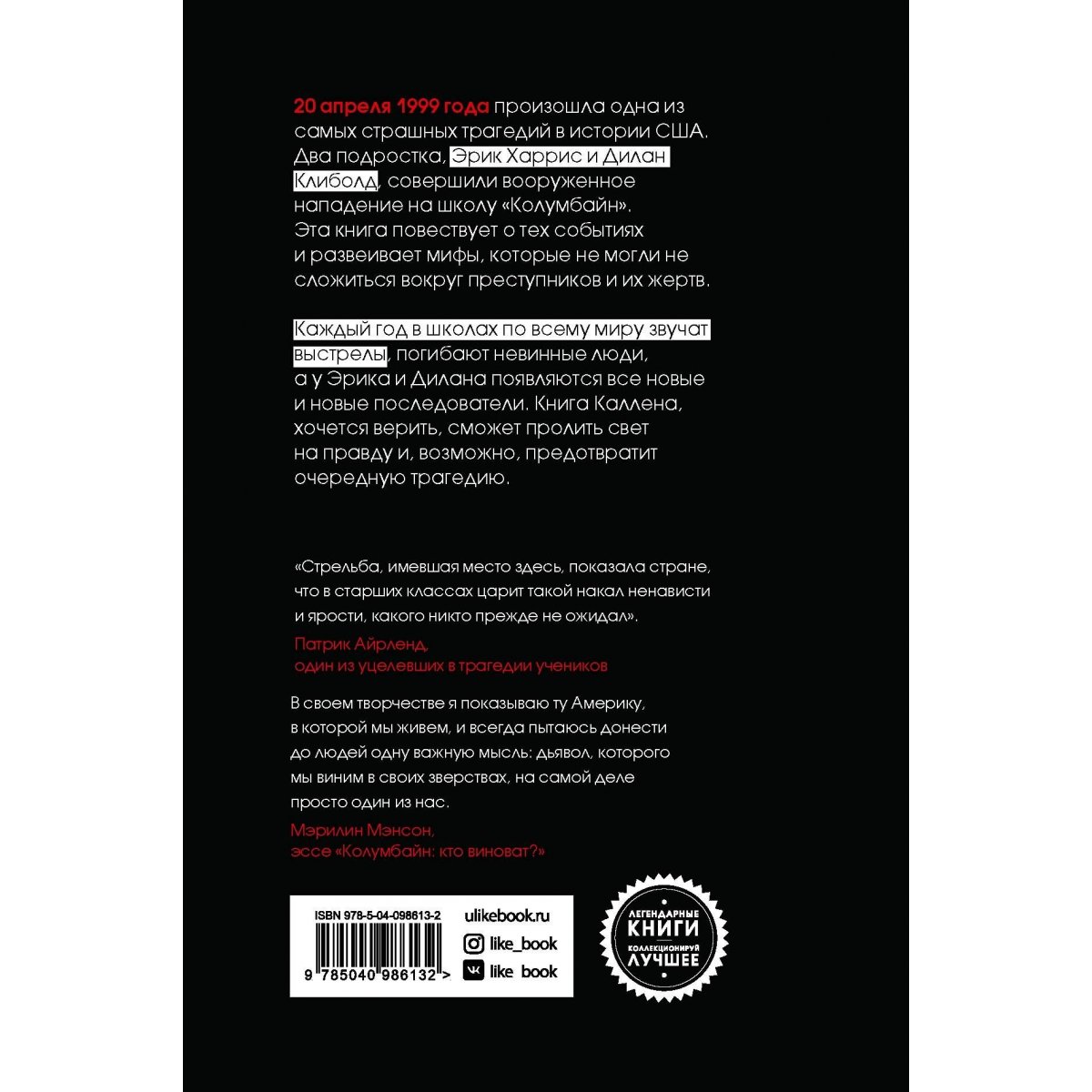 20 апреля 1999 года произошла одна из самых страшных трагедий в истории США. Два подростка, Эрик Харрис и Дилан Клиболд, совершили вооруженное нападение на школу "Колумбайн". Эта книга повествует о тех событиях и развеивает мифы, которые не могли не сложиться вокруг преступников и их жертв. Каждый год в школах по всему миру звучат выстрелы. Погибают невинные люди, а у Эрика и Дилана появляются все новые и новые последователи. Книга Каллена, хочется верить, сможет пролить свет на правду и, возможно, предотвратит очередную трагедию.
