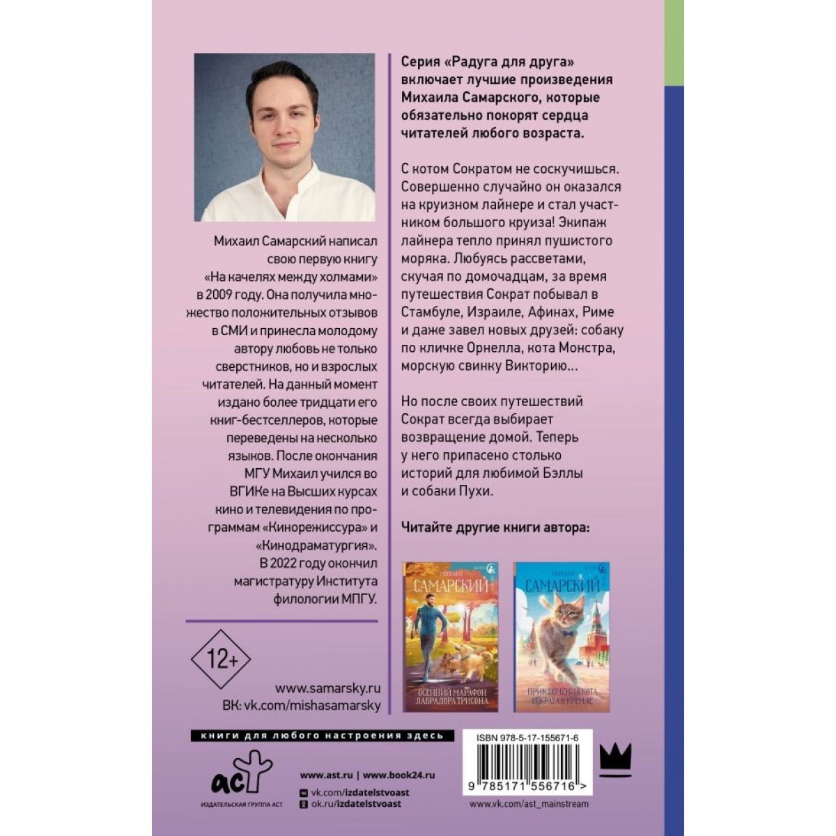 Михаил Самарский — молодой российский писатель. Свой первый роман «На качелях между холмами» он выпустил в 13 лет, уже тогда получив высокую оценку критиков. Светлые и душевные истории Михаила о дружбе, путешествиях и домашних питомцах идеальны для чтения вместе с детьми. Новую книгу можно читать отдельно или же в составе цикла о приключениях кота Сократа.