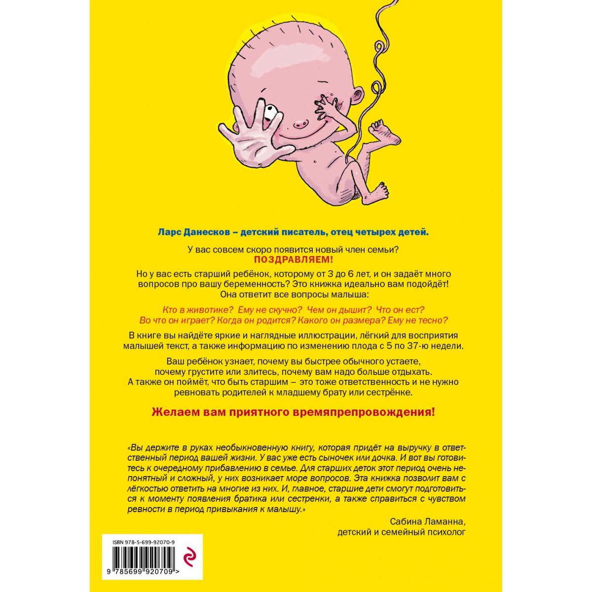 О чем книга Если у вас совсем скоро появится новый член семьи, но при этом уже есть старший ребенок, который хочет многое узнать про вашу беременность – эта книга для вас. Она станет незаменимым помощником и ответит на всевозможные вопросы малыша. Автор книги Ларс Данесков – детский писатель, отец четырех детей. Особенности книги В книге вы найдете яркие и наглядные иллюстрации, легкий для восприятия малышей текст, а также информацию по изменению плода с 5 по 37-ю недели. Как пользоваться книгой Книга подойдет для совместного времяпрепровождения с ребенком, а также для его самостоятельного изучения.