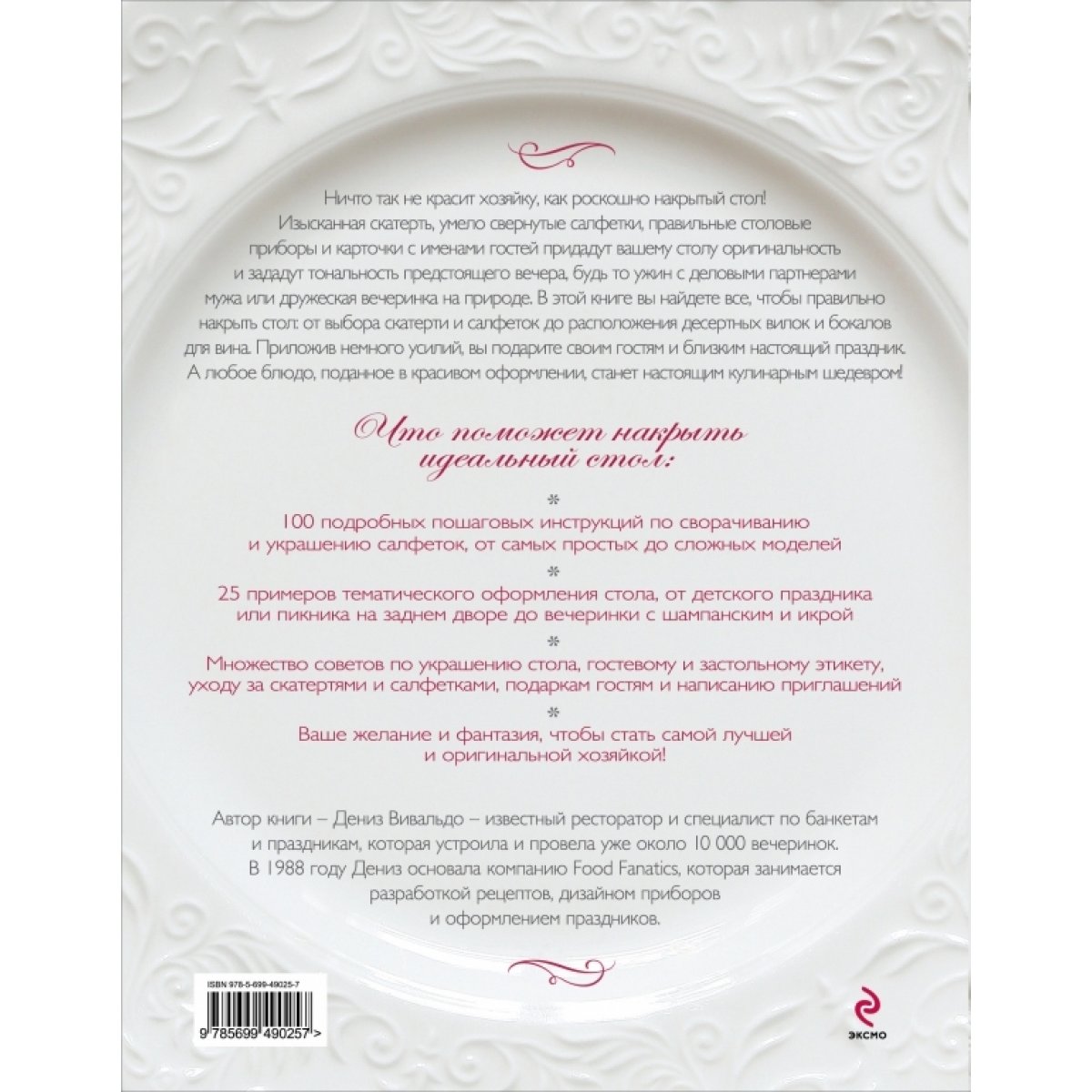 В этой книге вы найдете все, чтобы превратить обычный обед или ужин в настоящий праздник. 100 подробных пошаговых инструкций по сворачиванию и украшению салфеток, 25 примеров тематического оформления стола, от детского праздника до вечеринки с шампанским и икрой, советы по гостевому этикету, а также уходу за скатертями и салфетками. Автор книги, известный ресторатор и специалист по праздникам Дениз Вивальдо, расскажет все секреты правильно накрытого и оформленного стола. Приложив немного усилий, вы подарите своим гостям и близким настоящий праздник!