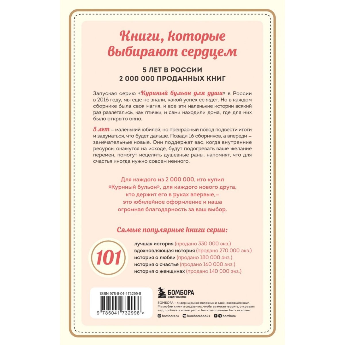 Тогда они придумали «Правило пяти»: ежедневно совершать по пять активных шагов по продвижению и продаже книги. С этого момента Кэнфилд и Хансен каждый день рассылали по 5 экземпляров журналистам, голливудским звездам, делали по 5 звонков руководителям компаний с предложением подарить книги сотрудникам. В итоге через 1,5 года было продано 1,3 миллиона экземпляров.