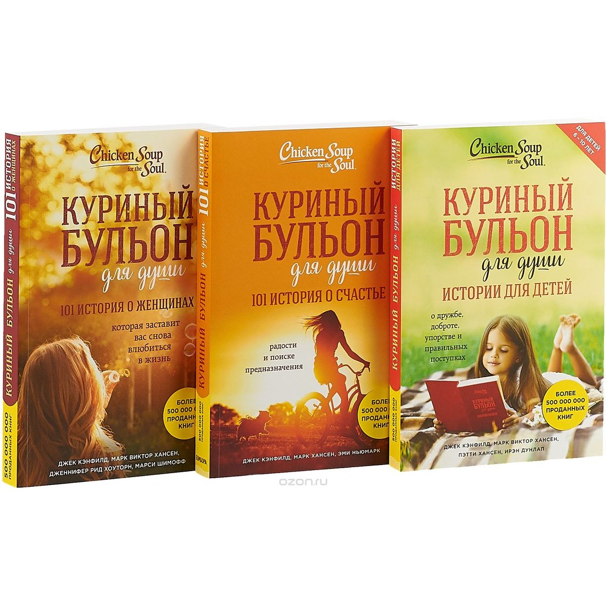 В детстве, когда вы болели, ваша бабушка давала вам куриный бульон. Сегодня питание и забота нужны вашей душе.Маленькие истории из «Куриного бульона» исцелят душевные раны и укрепят дух, дадут вашим мечтам новые крылья и откроют секрет самого большого счастья — счастья делиться и любить.В этот комплект входят книги:- 101 история о счастье- 101 история о женщинах - Истории для детейНачав читать, вы уже не сможете оторватьсяСтейси родилась не такой, как все, но получила от жизни все, что хотела.1716 писем понадобилось Луизе, прежде чем соединиться с любимым...Кейти сделала подарок девочке, с которой никто не хотел дружить.В детстве Лори находила монетки на дорожке в парке. Спустя двадцать лет она узнала, кто делал для нее маленькие чудеса...И другие 258 поразительных историй.