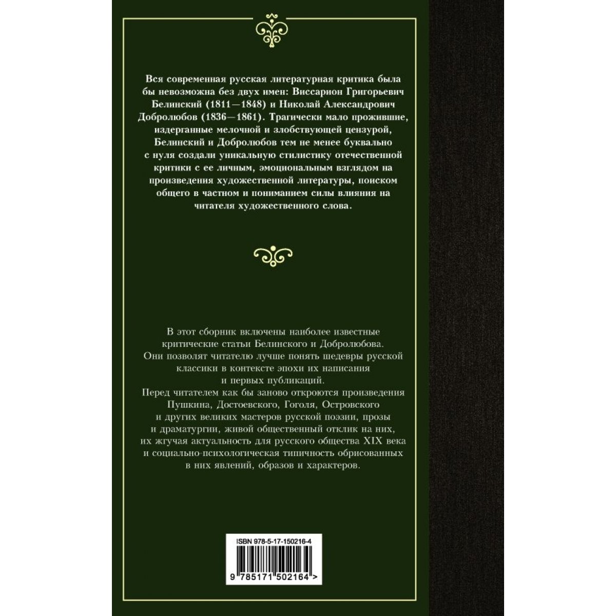 В этот сборник включены наиболее известные критические статьи Белинского и Добролюбова. Они позволят читателю лучше понять шедевры русской классики в контексте эпохи их написания и первых публикаций.