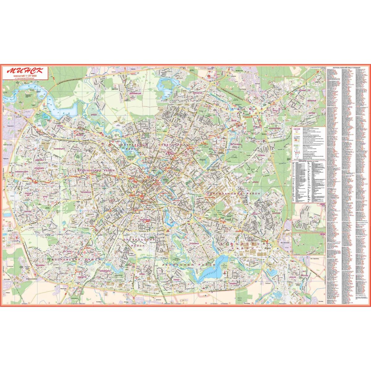 На одной стороне издания вы найдете подробную карту Минского района, на которой обозначены гидрография, населенные пункты (с указанием центров сельсоветов), пути сообщения, растительность и достопримечательности. На другой стороне расположен подробный план Минска. Обозначены все значимые объекты инфраструктуры и достопримечательности. Нет нумерации домов.