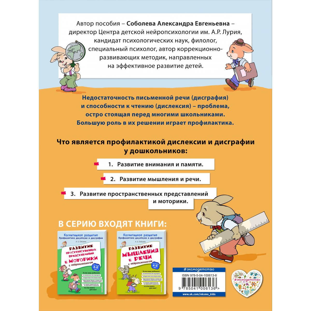 Пособие, соответствующее ФГОС, способствует формированию у ребёнка необходимых для будущего обучения высших психических функций — внимания и памяти, а также станет современной профилактикой дисграфии и дислексии у дошкольников. В книге использован нейропсихологический подход с элементами игры, как ведущего вида деятельности дошкольника. Выполняя увлекательные интерактивные задания, ребенок научится концентрировать внимание на конкретном задании, разовьёт память, будет более аккуратным и усидчивым. Педагогические подсказки для родителей изложены в каждом задании в блоке "Родителям". Яркую красочную книгу с добрыми весёлыми картинками удобно брать с собой в дорогу, чтобы занять ребенка полезным делом.