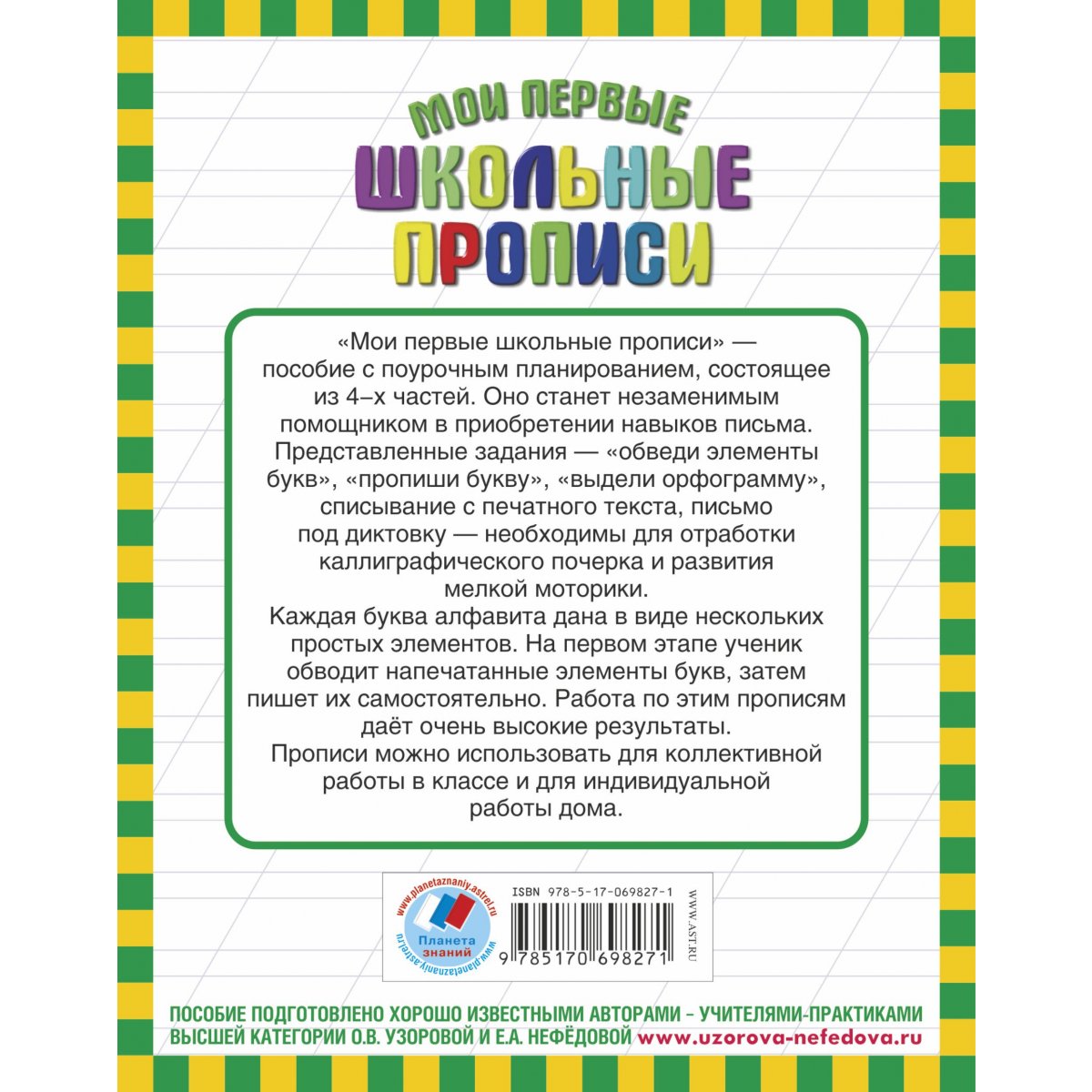 "Мои первые школьные прописи" - пособие с поурочным планированием, состоящее из 4-х частей. Оно станет незаменимым помощником в приобретении навыков письма. Представленные задания - "обведи элементы букв", "пропиши букву", "выдели орфограмму", списывание с печатного текста, письмо под диктовку - необходимы для отработки каллиграфического почерка и развития мелкой моторики. Каждая буква алфавита дана в виде нескольких простых элементов. На первом этапе ученик обводит напечатанные элементы букв, затем пишет их самостоятельно. Работа по этим прописям дает очень высокие результаты. Прописи можно использовать для коллективной работы в классе и для индивидуальной работы дома.