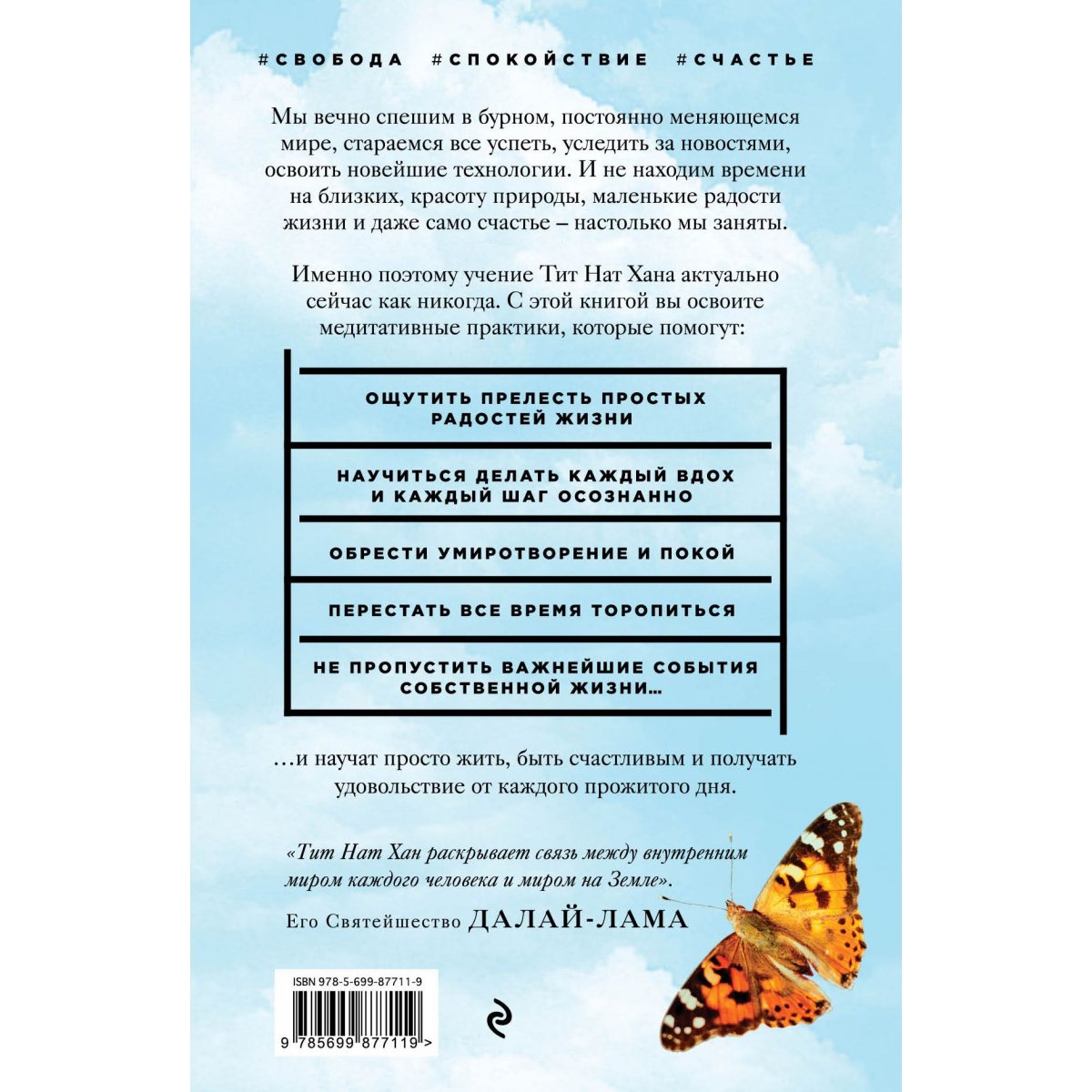 С помощью специальных практик, медитаций и техник осознанного дыхания, которыми делится Тит Нат Хан, вы научитесь жить в моменте, откроете красоту бытия и сможете наладить свою жизнь – ведь чтобы обрести гармонию в отношениях с миром и людьми вокруг, необходимо сначала обрести гармонию внутри себя. Книга поможет избавиться от сожалений, страхов и суеты, отпустить сожаление о прошлом и переживания о будущем. Мы постоянно спешим, стараясь успеть все в бурном, постоянно меняющемся мире, уследить за новостями и освоить новейшие технологии. И не находим времени на близких, красоту природы, маленькие радости жизни и даже само счастье – настолько мы заняты. Именно поэтому учение Тит Нат Хана актуально сейчас как никогда для всех нас: понятным и простым языком он рассказывает, как, опираясь на древние идеи буддизма, найти счастье в современном мире и ощущать вкус жизни, что бы ни происходило вокруг.