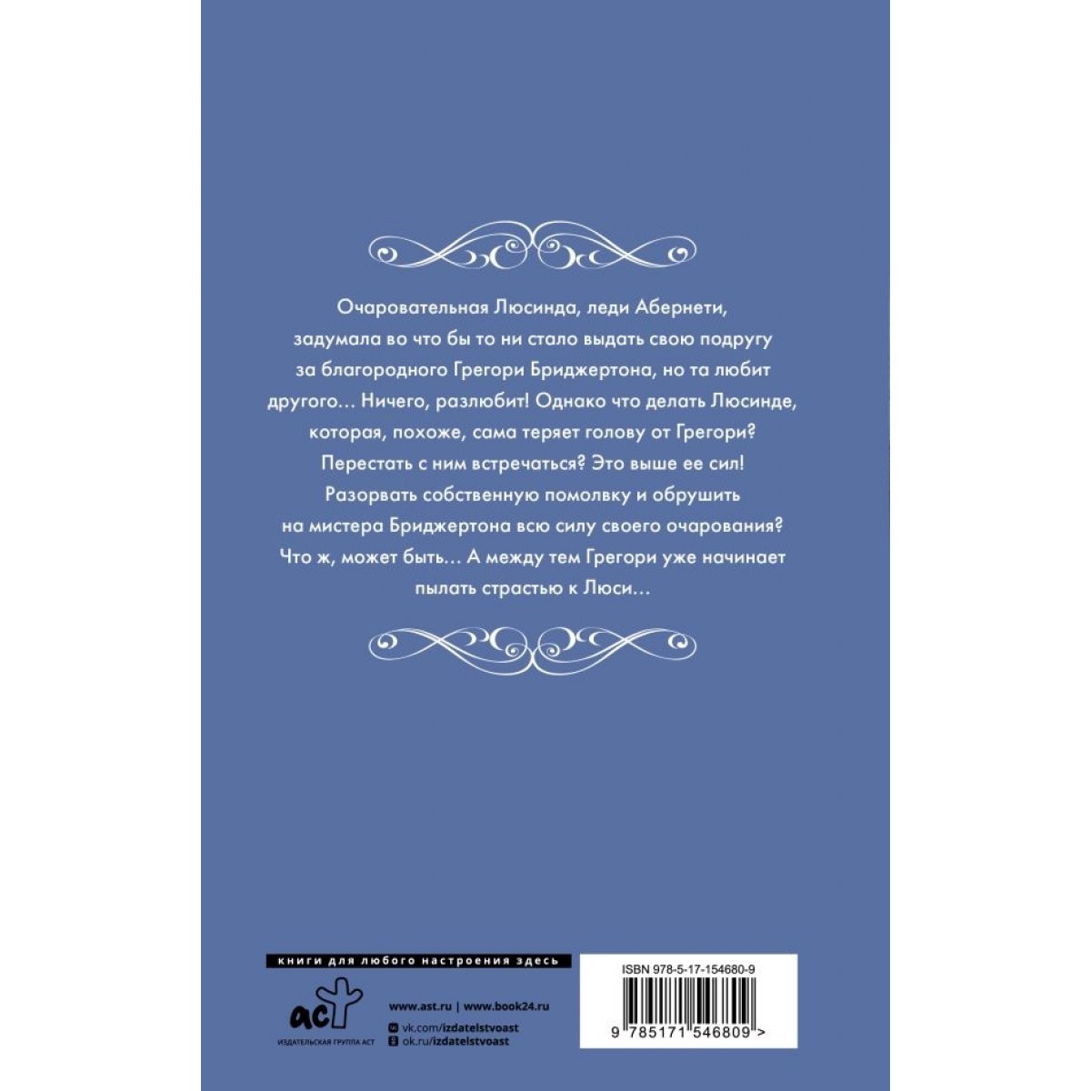 Последняя книга цикла «Бриджертоны». Снятый по мотивам первых книг цикла сериал стал одним из самых успешных в истории сервиса Netflix. Яркая история неудержимой любви двух человек, противостоящих всему миру и, прежде всего, себе. Люсинда поклялась во что бы то ни стало выдать свою подругу замуж за Грегори Бриджертона. Но как же быть, если та давно влюблена в другого, а сама Люсинда воспылала чувствами к мистеру Бриджертону. А что, если это взаимно?