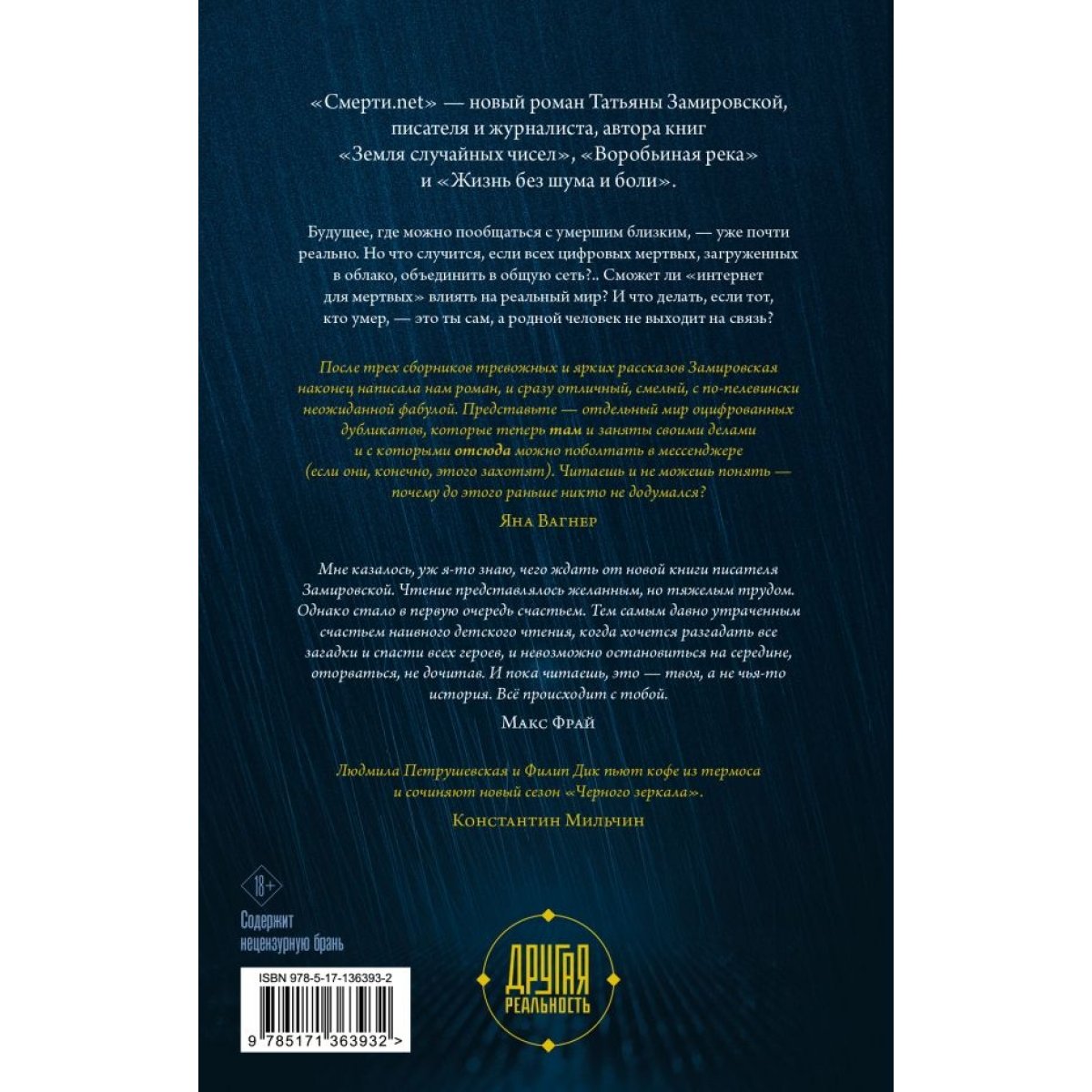 «Смерти.net» — новый роман Татьяны Замировской, писателя и журналиста, автора книг «Земля случайных чисел», «Воробьиная река» и «Жизнь без шума и боли».