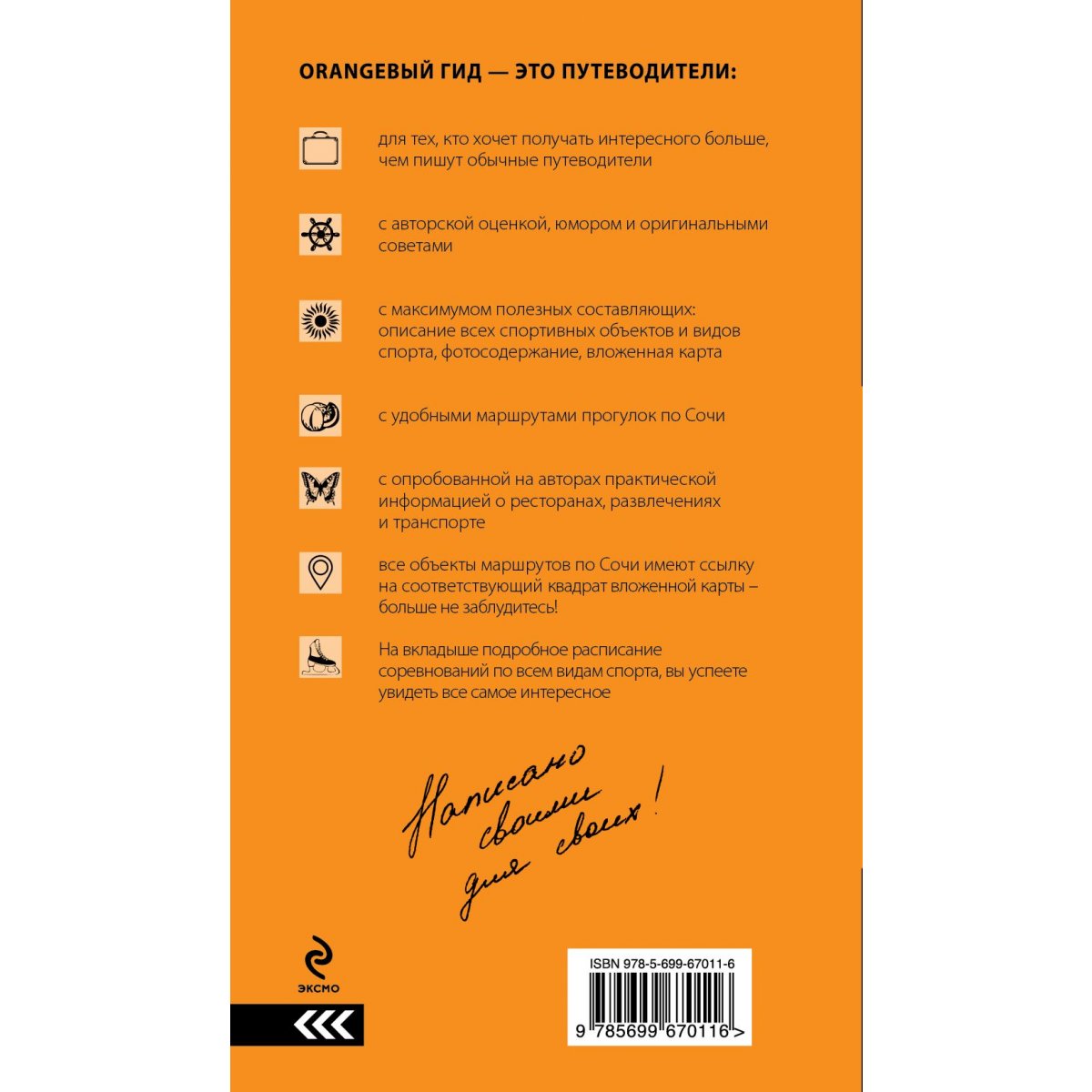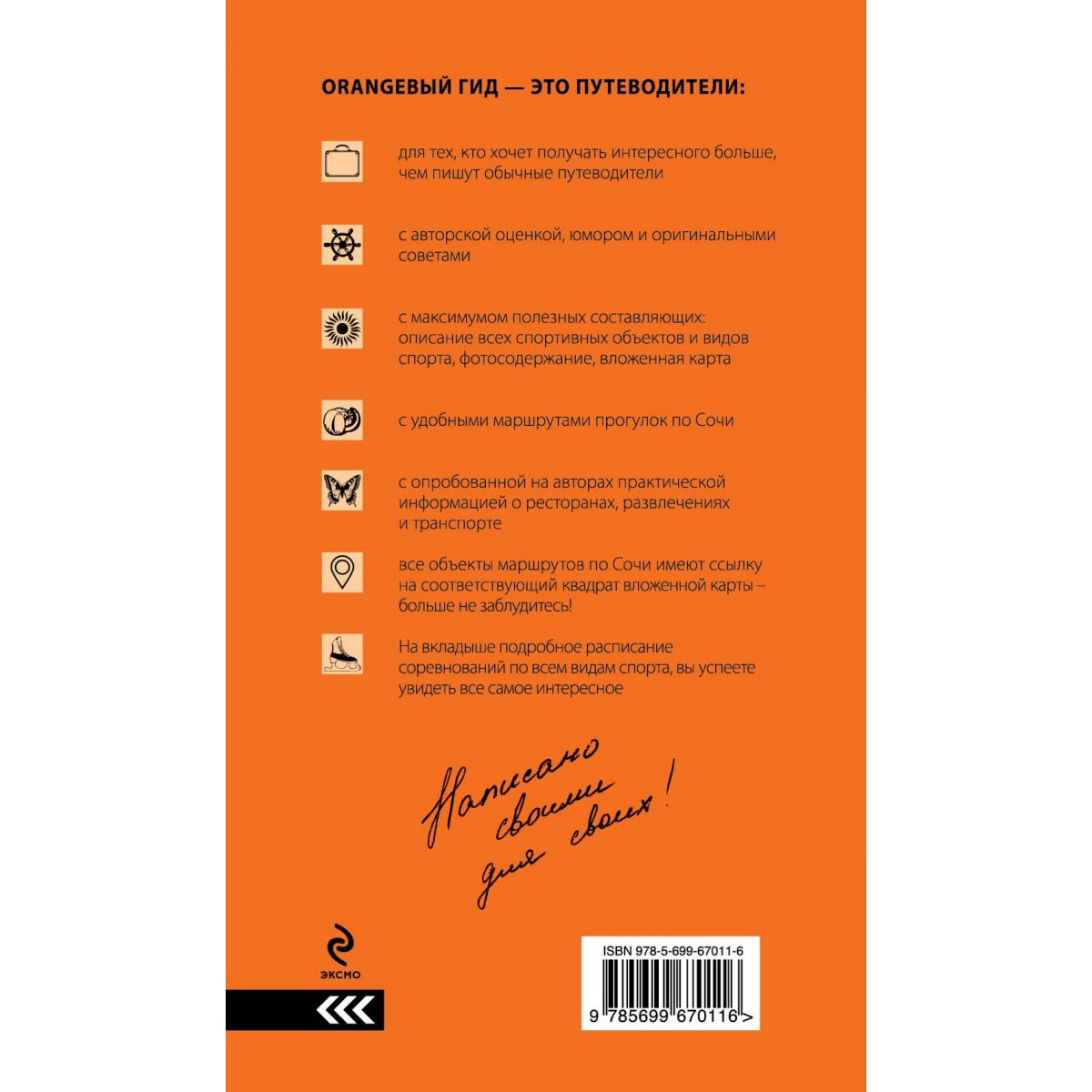 Сочи всегда был, есть и остается главным курортом страны, туристической Меккой, куда стремятся попасть все, кто жаждет моря, солнца и отличного отдыха. Теперь город ассоциируется не только с многочисленными пляжами, санаториями и пальмами, но и с важнейшим для России и всего мира событием - Олимпийскими зимними играми "Сочи 2014". Оранжевый гид не даст вам потеряться в Олимпийской столице! В нашем путеводителе вы сможете найти все самое интересное про зимние виды спорта, ознакомиться с расписанием соревнований, изучить олимпийские объекты Сочи. В гид также включены увлекательные маршруты прогулок по Сочи и Адлеру с указанием основных достопримечательностей, практические советы о том, где разместиться, поесть и развлечься в Олимпийской столице, а также подробная карта города. Посетите Олимпийский Сочи - ведь скоро этот город станет настоящей легендой! Для лиц старше 16 лет.