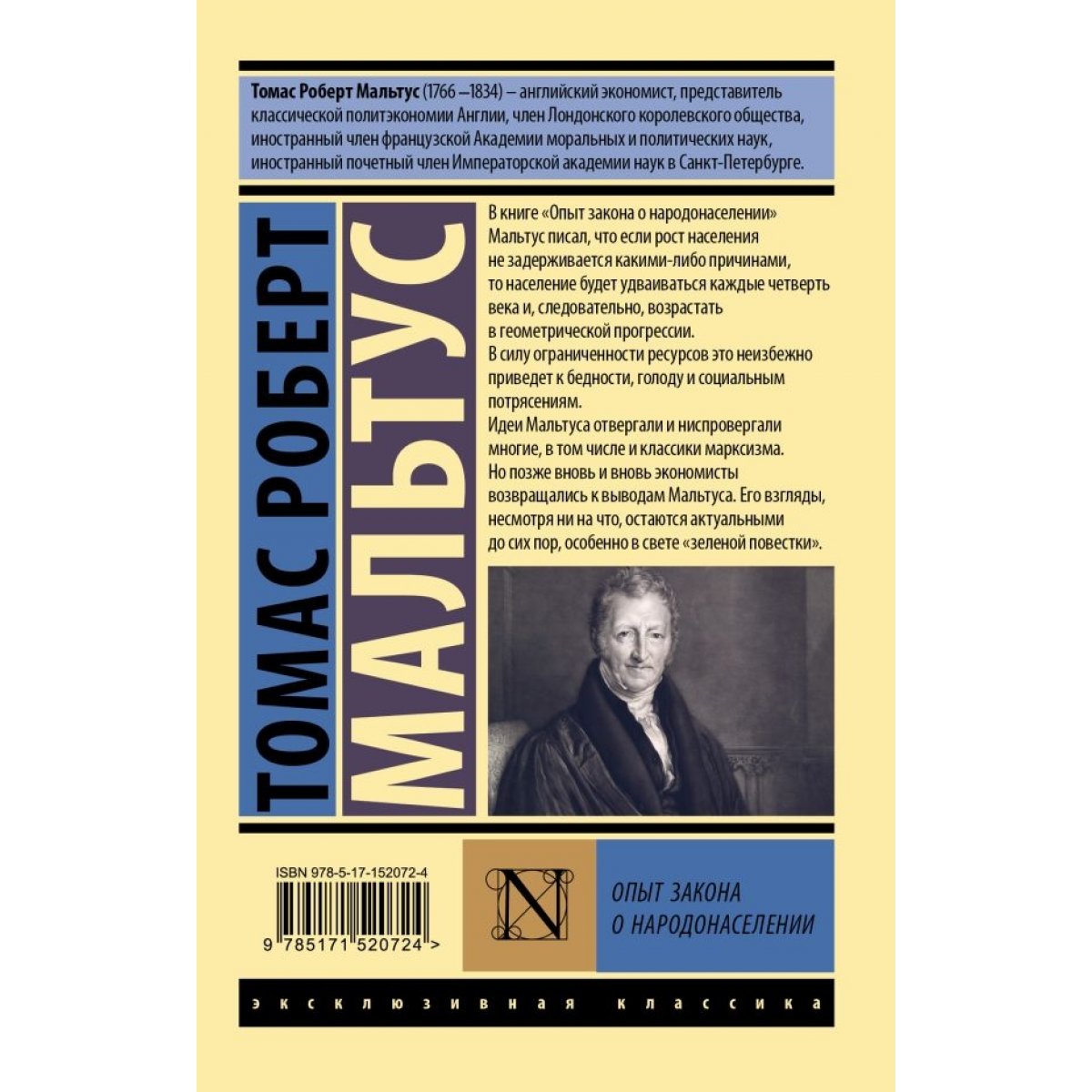 В книге "Опыт закона о народонаселении" Мальтус писал, что если рост населения не задерживается какими-либо причинами, то население будет удваиваться каждые четверть века, и, следовательно, возрастать в геометрической прогрессии. В силу ограниченности ресурсов это неизбежно приведёт к бедности, голоду и социальным потрясениям.