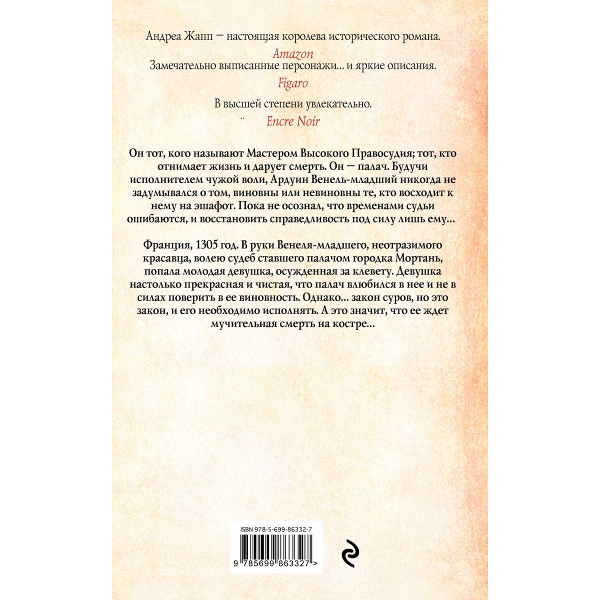 Он тот, кого называют Мастером Высокого Правосудия; тот, кто отнимает жизнь и дарует смерть. Он – палач. Будучи исполнителем чужой воли, Ардуин Венель-младший никогда не задумывался о том, виновны или невиновны те, кто восходит к нему на эшафот. Пока не осознал, что временами судьи ошибаются, и восстановить справедливость под силу лишь ему… Франция, 1305 год. В руки Венеля-младшего, неотразимого красавца, волею судеб ставшего палачом городка Мортань, попала молодая девушка, осужденная за клевету. Девушка настолько прекрасная и чистая, что палач влюбился в нее и не в силах поверить в ее виновность. Однако… закон суров, но это закон, и его необходимо исполнять. А это значит, что ее ждет мучительная смерть на костре…