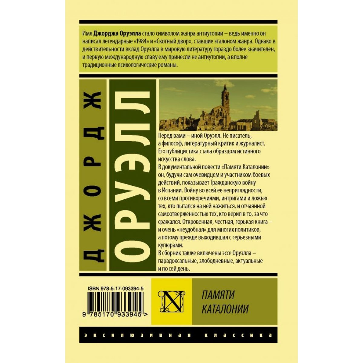 В документальной повести «Памяти Каталонии» он, будучи сам очевидцем и участником боевых действий, показывает Гражданскую войну в Испании. Войну во всей ее неприглядности, со всеми противоречиями, интригами и ложью тех, кто пытался на ней нажиться, и отчаянной самоотверженностью тех, кто верил в то, за что сражался. Откровенная, честная, горькая книга – и очень «неудобная» для многих политиков, а потому прежде выходившая с серьезными купюрами. В сборник также включены эссе Оруэлла – парадоксальные, злободневные, актуальные и по сей день.