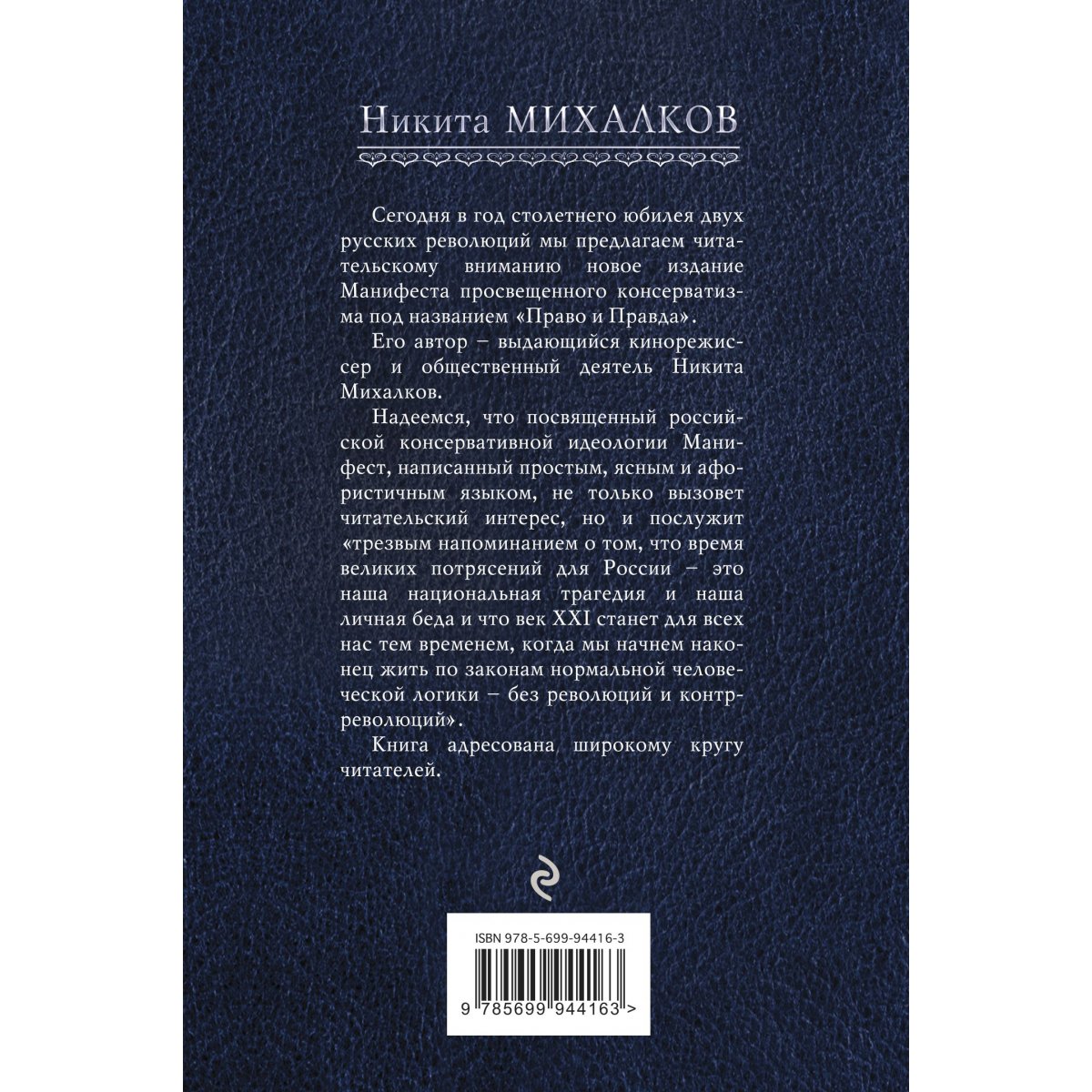 Сегодня в год столетнего юбилея двух русских революций мы предлагаем читательскому вниманию новое издание Манифеста просвещенного консерватизма под названием «Право и Правда». Его автор – выдающийся кинорежиссер и общественный деятель Никита Михалков. Надеемся, что посвященный российской консервативной идеологии Манифест, написанный простым, ясным и афористичным языком не только вызовет читательский интерес, но и послужит: «трезвым напоминанием о том, что время великих потрясений для России – это наша национальная трагедия и наша личная беда, и что век XXI станет для всех нас тем временем, когда мы начнём, наконец, жить по законам нормальной человеческой логики – без революций и контрреволюций». Книга адресована широкому кругу читателей.
