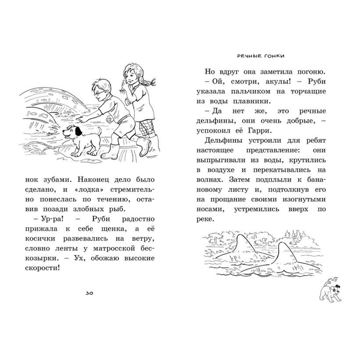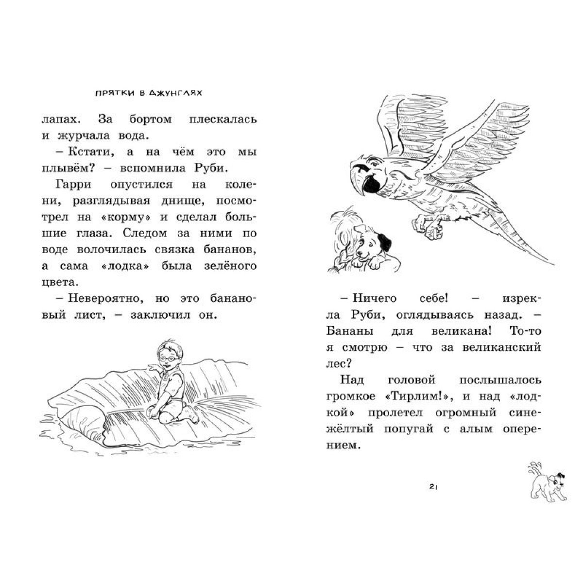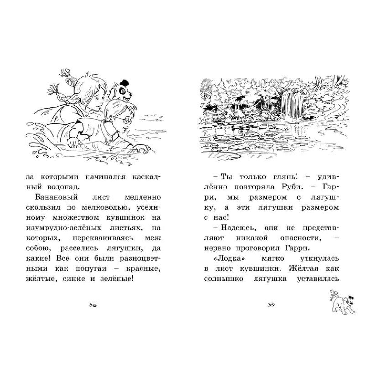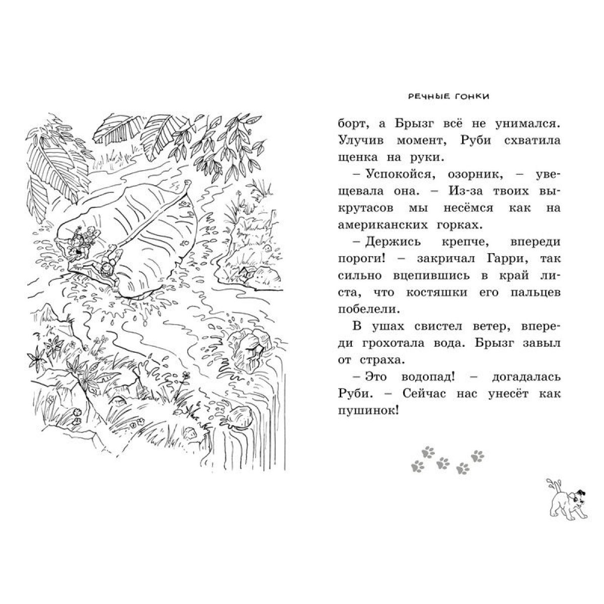 Руби и Гарри всегда с нетерпением ждут дождя. Ведь каждый раз вместе со щенком Брызгом они отправляются в волшебное путешествие, полное загадок и приключений! Кроме захватывающей истории юные читатели найдут в книгах интересные развивающие задания, головоломки и пазлы. В этот раз дружная троица перемещается в самые настоящие тропические леса. Только вот незадача: всё вокруг стало просто огромным, и даже лягушки размером с человека. Ребятам предстоит разгадать тайну украденных у обитателей джунглей любимых игрушек!