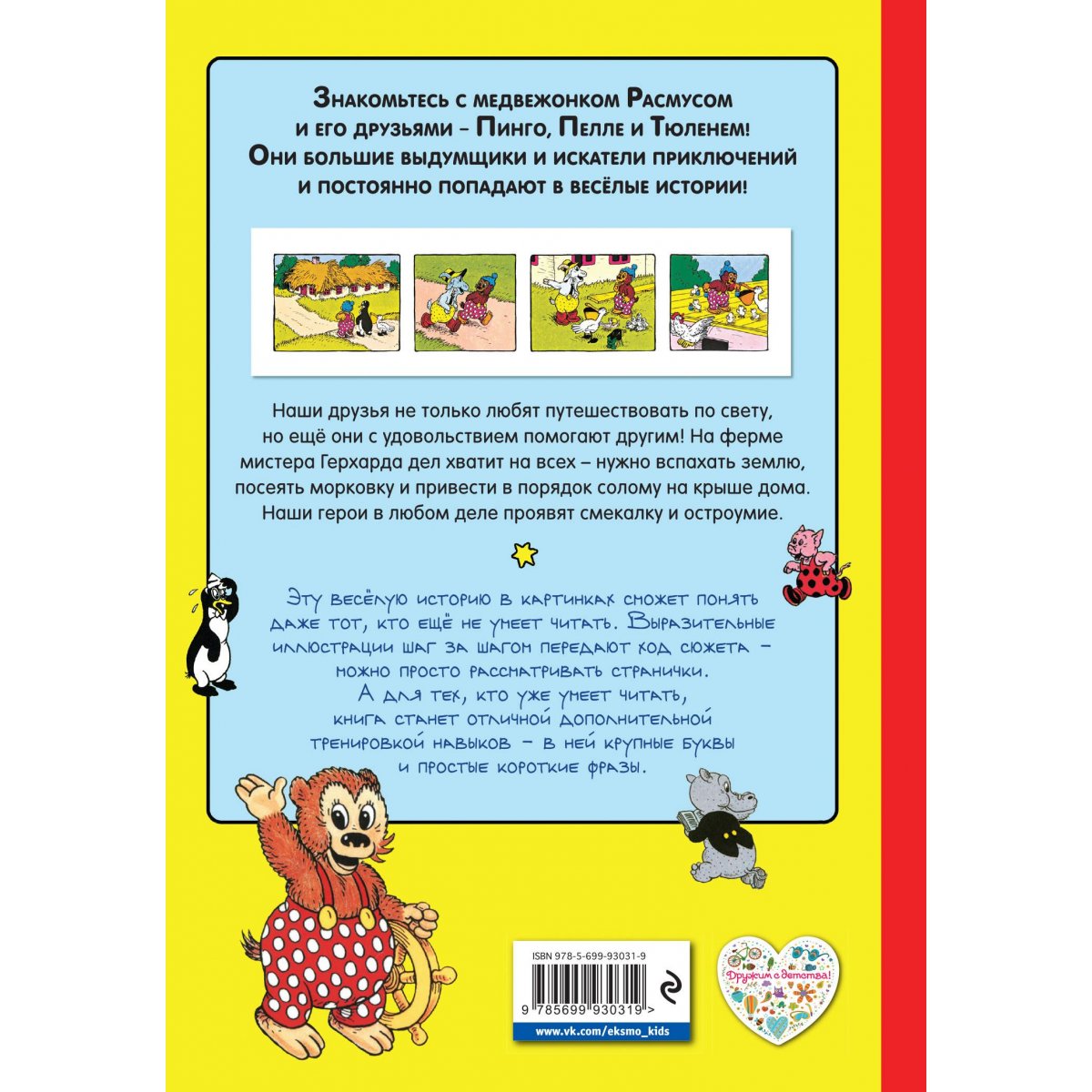 Знакомьтесь с медвежонком Расмусом и его друзьями – Пинго, Пелле и Тюленем! Они большие выдумщики и искатели приключений и постоянно попадают в весёлые истории!Наши друзья не только любят путешествовать по свету, но ещё они с удовольствием помогают другим! На ферме мистера Герхарда дел хватит на всех – нужно вспахать землю, посеять морковку и привести в порядок солому на крыше дома. Наши герои в любом деле проявят смекалку и остроумие!Эту весёлую историю в картинках сможет понять даже тот, кто ещё не умеет читать. Выразительные иллюстрации шаг за шагом передают ход сюжета – можно просто рассматривать странички. А для тех, кто уже умеет читать, книга станет отличной дополнительной тренировкой навыков – в ней крупные буквы и простые короткие фразы.