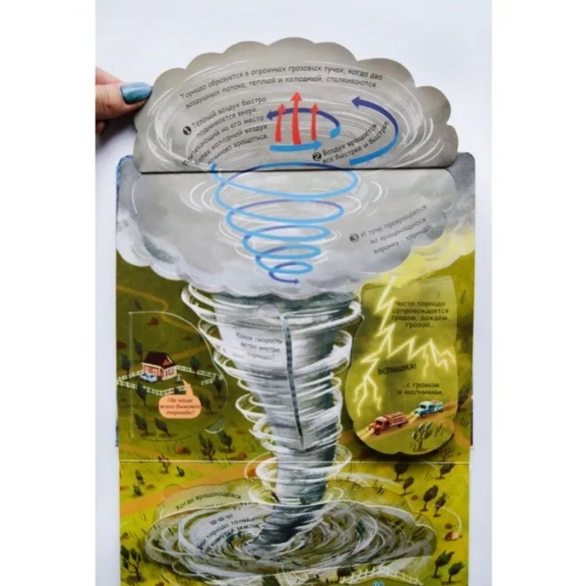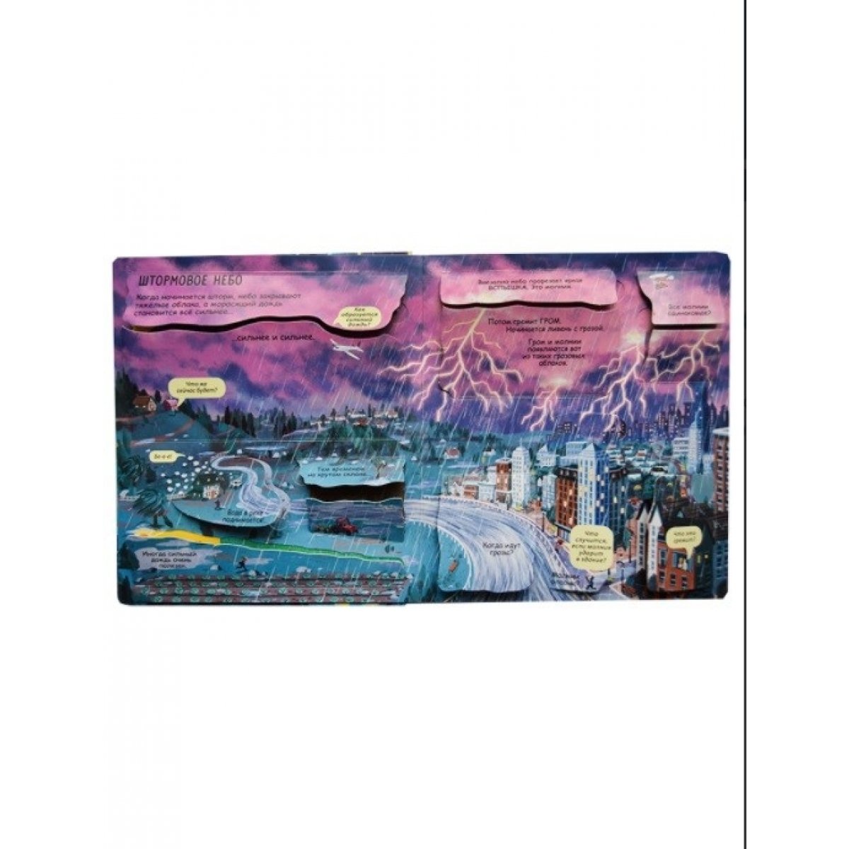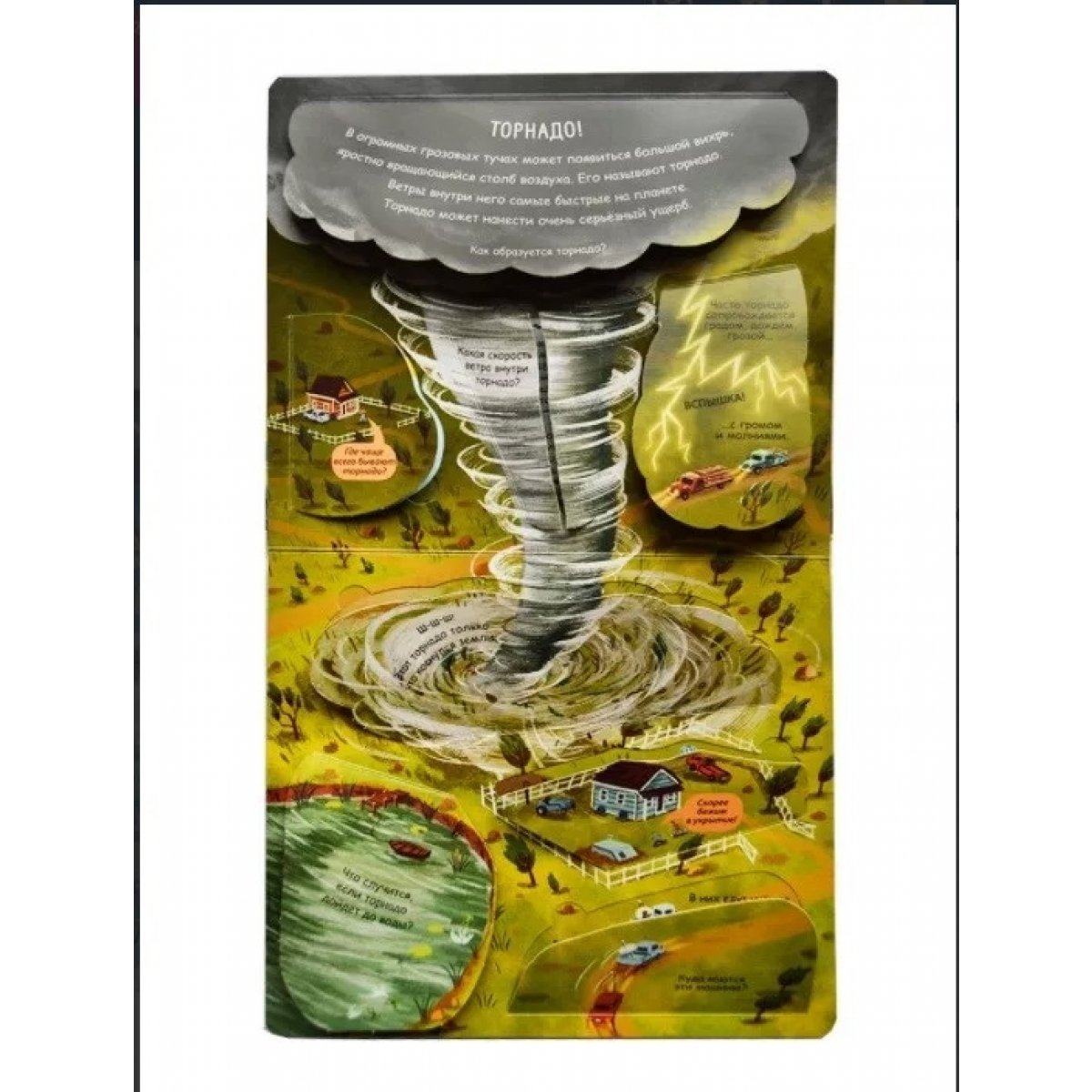 Яркие и детальные иллюстрации, а также более 55 створок, за которыми спрятано множество интересных фактов о смертоносных засухах и ужасающих торнадо, лесных пожарах и снежных бурях, опасных наводнениях и многом другом.