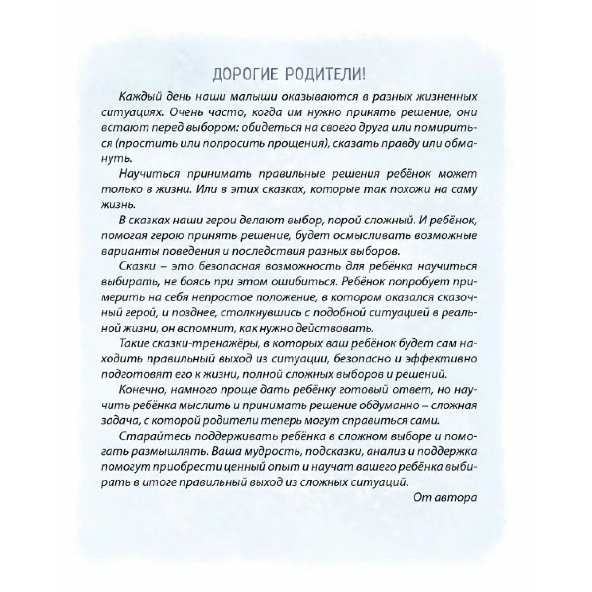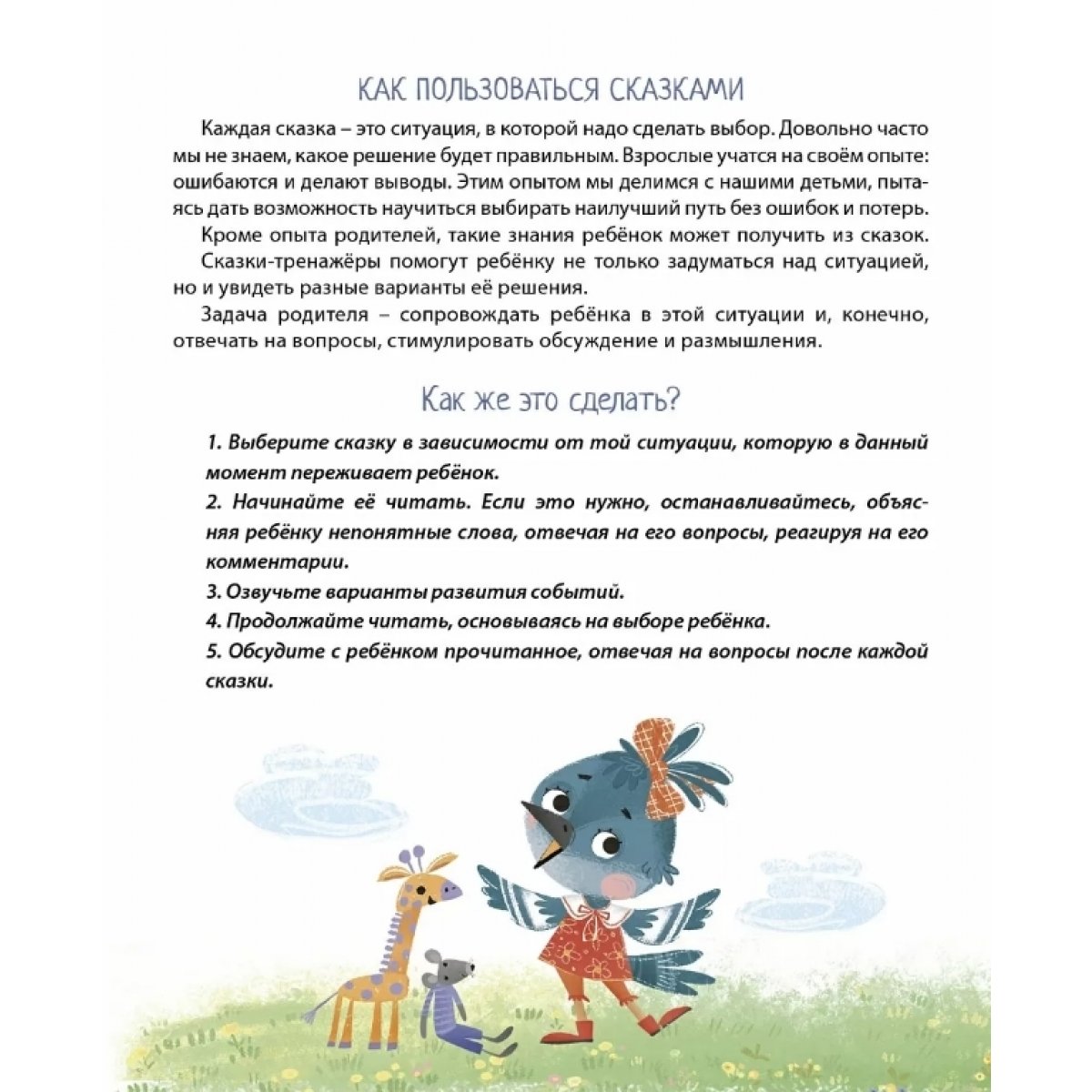 Книга состоит из сказок-тренажёров, в которых ребёнок будет сам находить правильный выход из ситуации, безопасно и эффективно готовиться к жизни, полной сложных выборов и решений. Конечно, намного проще дать ребёнку готовый ответ, но научить ребёнка мыслить и принимать решение обдуманно – сложная задача, с которой родители теперь могут справиться сами.