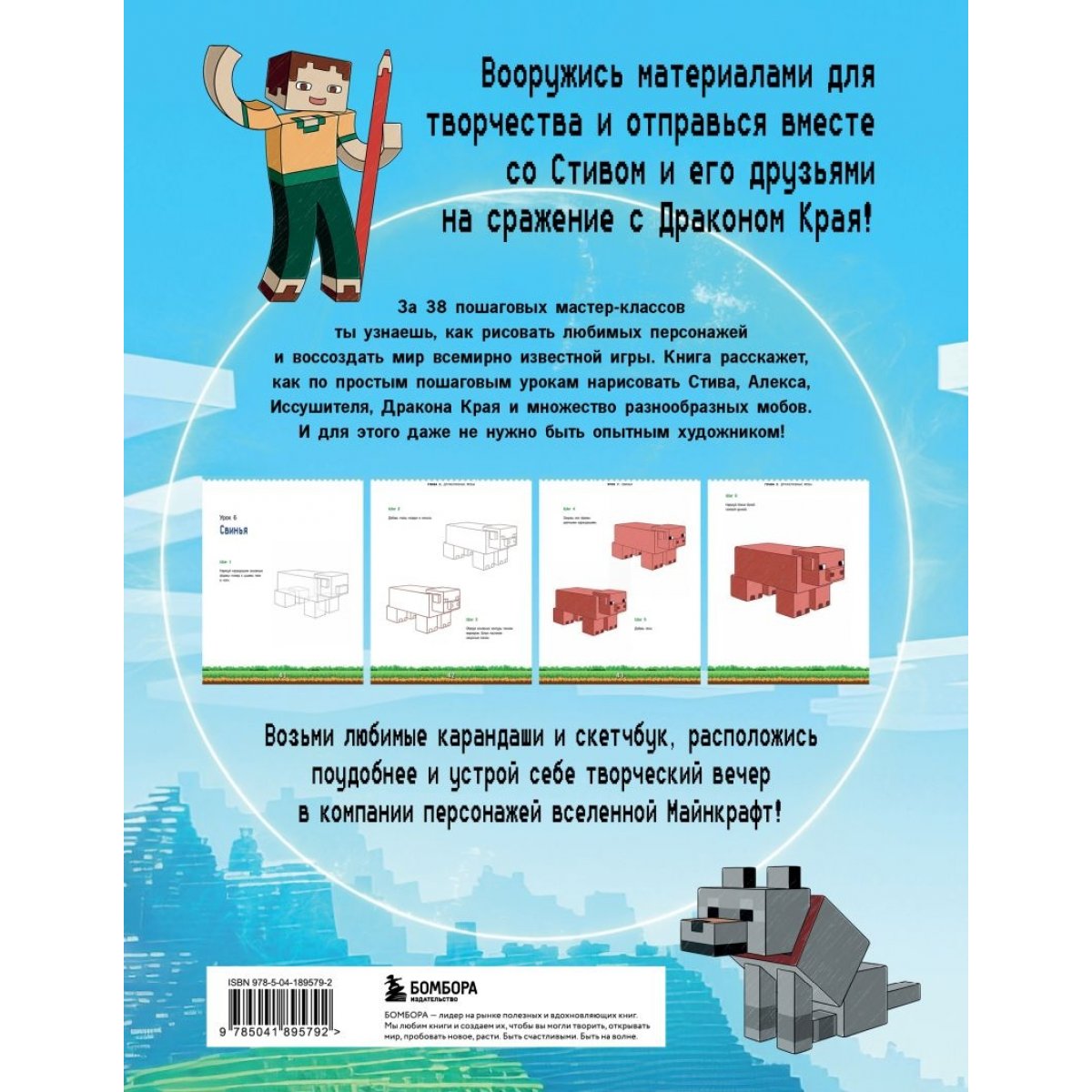 Постепенно ты откроешь для себя секреты создания персонажей любой сложности из вселенной Майнкрафт. Ты узнаешь множество полезных советов по построению света и тени, а также покрасу финального изображения. Внутри ты найдешь почти 40 мастер-классов по рисованию оружия, главных героев, дружелюбных, нейтральных и враждебных мобов, и даже боссов!
