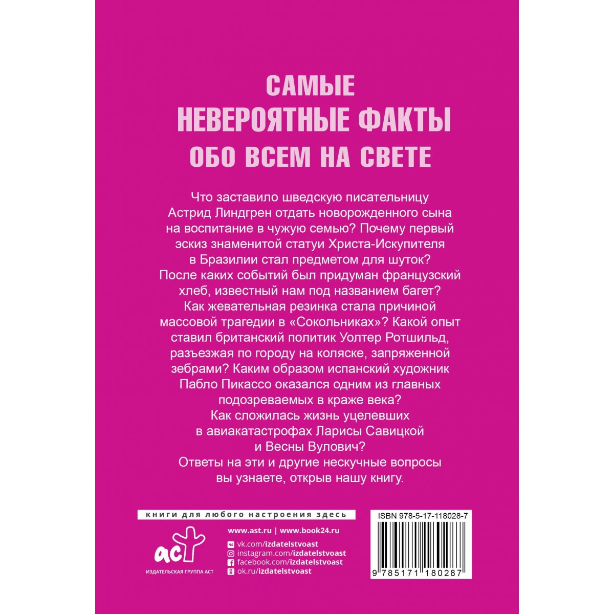 Что заставило шведскую писательницу Астрид Линдгрен отдать новорожденного сына на воспитание в чужую семью? Почему первый эскиз знаменитой статуи Христа-Искупителя в Бразилии стал предметом для шуток? После каких событий был придуман французский хлеб, известный нам под названием багет? Как жевательная резинка стала причиной массовой трагедии в "Сокольниках"? Какой опыт ставил британский политик Уолтер Ротшильд, разъезжая по городу на коляске, запряженной зебрами? Каким образом испанский художник Пабло Пикассо оказался одним из главных подозреваемых в краже века? Как сложилась жизнь уцелевших в авиакатастрофах Ларисы Савицкой и Весны Вулович? Ответы на эти и другие нескучные вопросы вы узнаете, открыв нашу книгу.