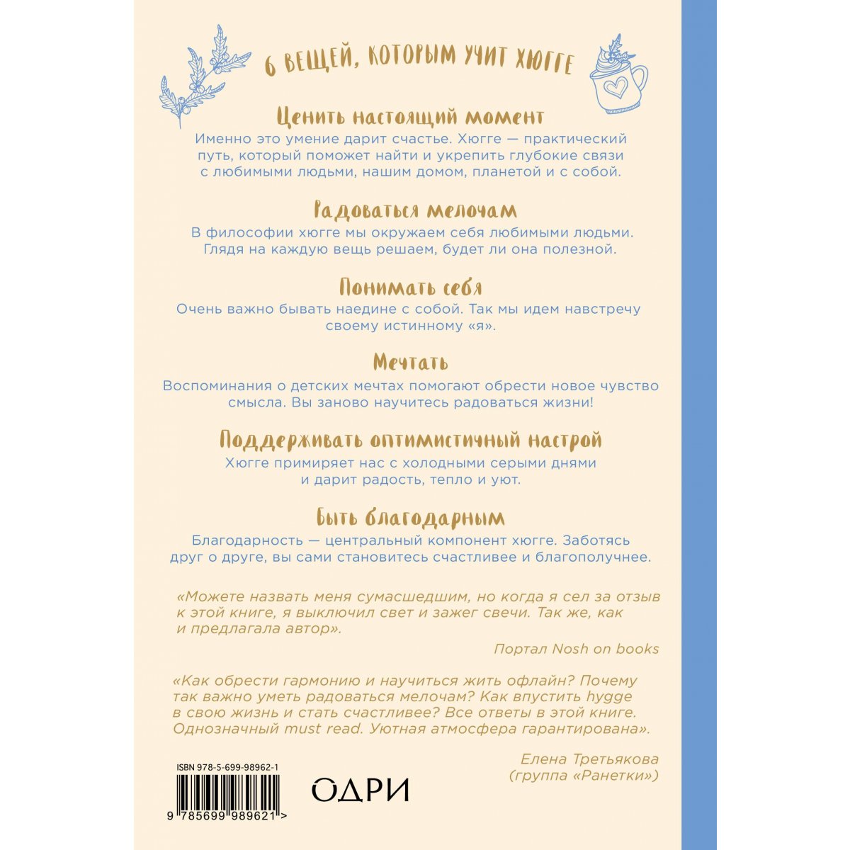 Проживите 30 дней по хюгге, пользуясь подсказками автора.- Поужинайте с другом, которого давно не видели. - Не берите в руки гаджеты. - Посмотрите на закат. - Запишите в дневник то, о чем мечтаете.6 вещей, которым учит хюгге1. Ценить настоящий момент. Именно это умение дарит счастье. Хюгге – практический путь, который поможет найти и укрепить глубокие связи с любимыми людьми, нашим домом, планетой и с собой.2. Радоваться мелочам. В философии хюгге мы окружаем себя любимыми людьми, а богатство оцениваем не лишними вещами. Мы оцениваем каждую вещь и решаем, будет ли она полезной. 3. Понимать себя. Бывать наедине с собой очень важно, ведь лишь в одиночестве мы можем мечтать и размышлять. Свыкнувшись с «ничегонеделанием» и направив свой взгляд вглубь, мы совершаем первый шаг навстречу своему истинному «я».4. Мечтать. Вспоминая о заветных детских мечтах, мы понимаем, что важно именно для нас, и обретаем новое чувство смысла. Возможно, даже заново учимся радоваться со всей искренностью – как умеют только дети.5. Стремиться к позитиву и поддерживать оптимистичный настрой. Хюгге примиряет нас с холодными серыми днями, даря радость, тепло и уют.6. Быть благодарным. Благодарность – центральный компонент хюгге. Заботясь друг о друге, мы становимся счастливее и благополучнее.ОБ АВТОРЕПия Эдберг – писательница, художница, предприниматель. Интересуется вопросами саморазвития и посвятила этому последние 15 лет. Мечтает делиться тем, чему научилась сама, и вдохновлять людей. В свободное от творчества время она гуляет по антикварным лавочкам, играет на гитаре, занимается йогой и танцами.О КНИГЕКнига входит в 100 самых покупаемых электронных книг на Amazon.comЭто самая первая книга о хюгге, с которой началось мировое стремление к счастью по-датски. ОТЗЫВЫ«Можете назвать меня сумасшедшим, но когда я сел за отзыв к этой книги, я выключил свет и зажег свечи. Так же, как и предлагала автор». Портал Nosh on booksКак обрести гармонию и научиться жить офлайн, почему так важно замедлиться и уметь радоваться мелочам, как впустить хюгге в свою жизнь и стать счастливее – все ответы в этой книге. Однозначный must read. Уютная атмосфера гарантирована. Елена Третьякова (группа "Ранетки")«Ощущения от прочтения этой книги такие же уютные и теплые, как объятия близкого человека». Кэтлин Дампьер, блогер