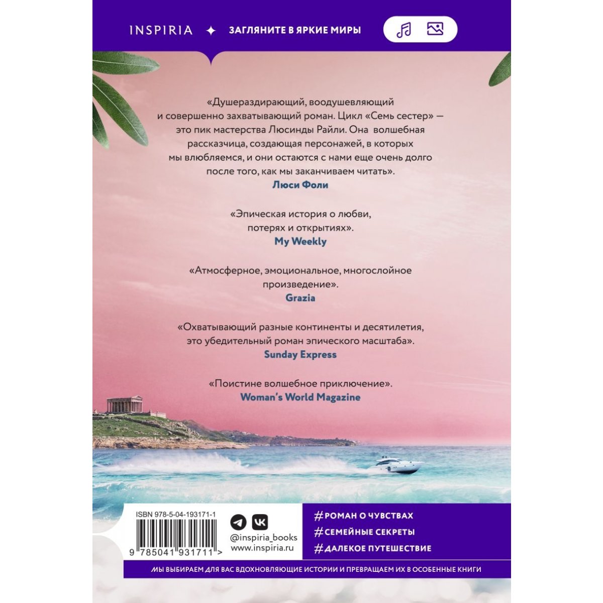 «Душераздирающий, воодушевляющий и совершенно захватывающий роман. Цикл "Семь сестер" — это пик мастерства Люсинды Райли. Она — волшебная рассказчица, создающая персонажей, в которых мы влюбляемся, и они остаются с нами еще очень долго после того, как мы заканчиваем читать». — Люси Фоли