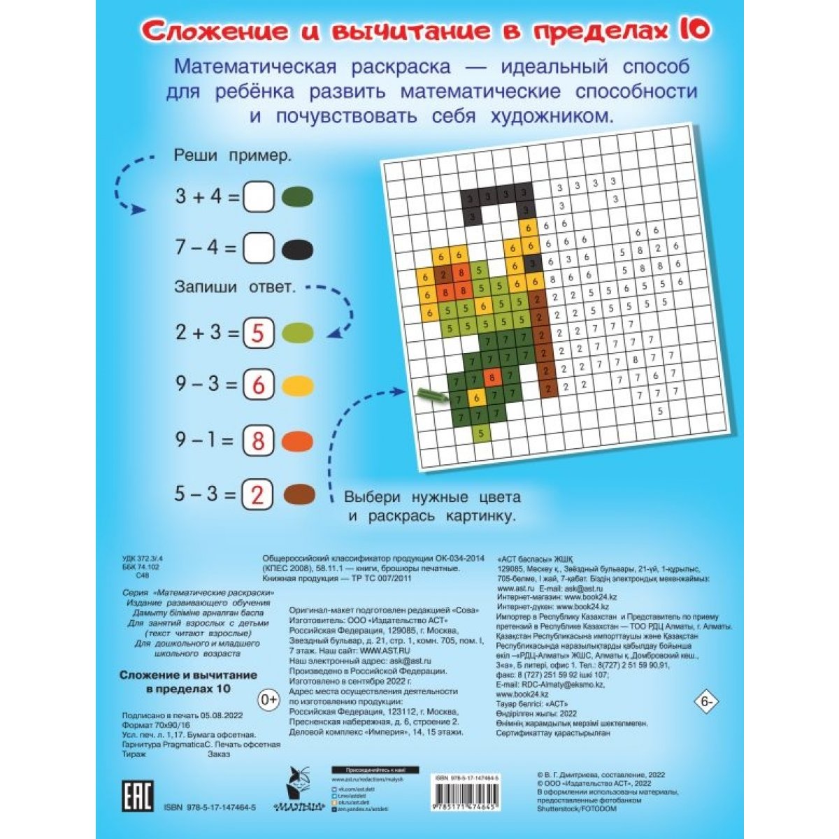 Сложение и вычитание в пределах 10" — это одновременно и сборник примеров по математике для учеников младших классов, и замечательная книжка-раскраска. Решая примеры и раскрашивая клеточки по числам-ответам, ребёнок будет создавать красочные картинки. Отличный способ научиться складывать и вычитать в пределах 10, развить графические навыки, потренировать мелкую моторику.