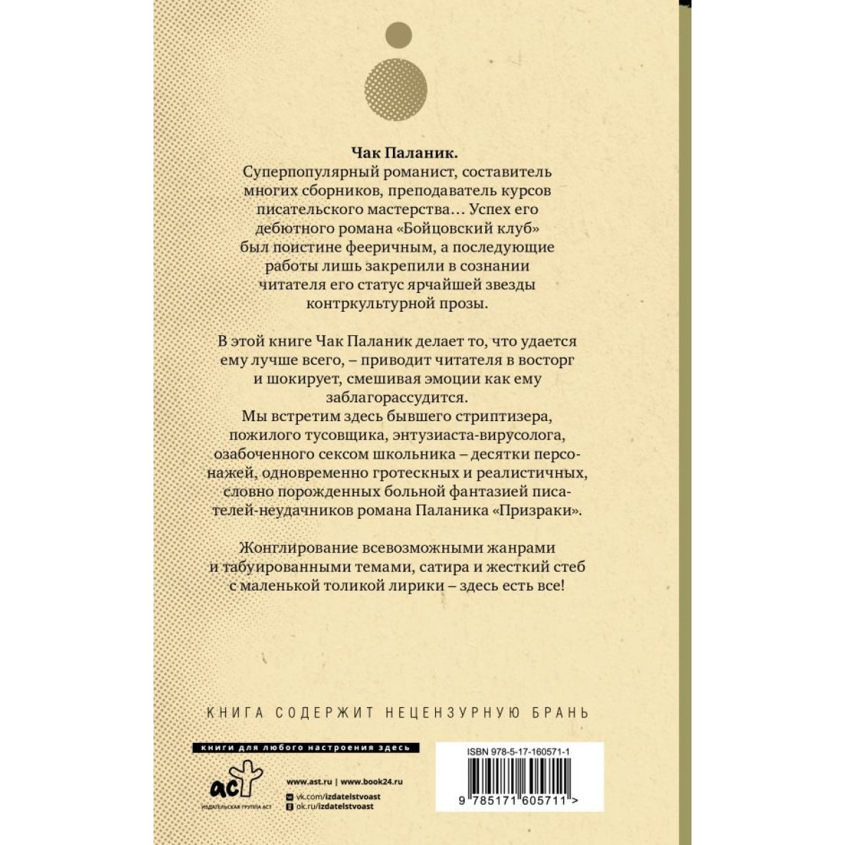 Мы встретим здесь бывшего стриптизера, пожилого тусовщика, энтузиаста-вирусолога, озабоченного сексом школьника – десятки персонажей, одновременно гротескных и реалистичных, словно порожденных больной фантазией писателей-неудачников романа Паланика "Призраки".