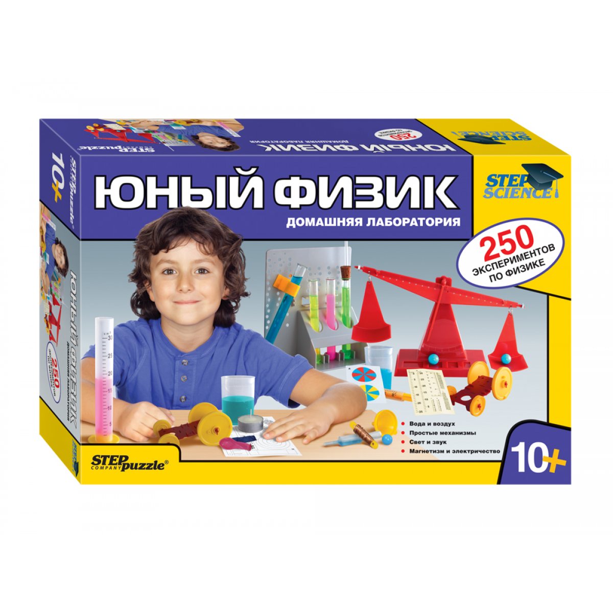Юный физик – это домашняя лаборатория, где есть все необходимое оборудование для проведения более чем 250 экспериментов по физике. Проводя опыты, юный естествоиспытатель узнает: о воде и воздухе; простых механизмах; свете и звуке; магнетизме и электричестве.